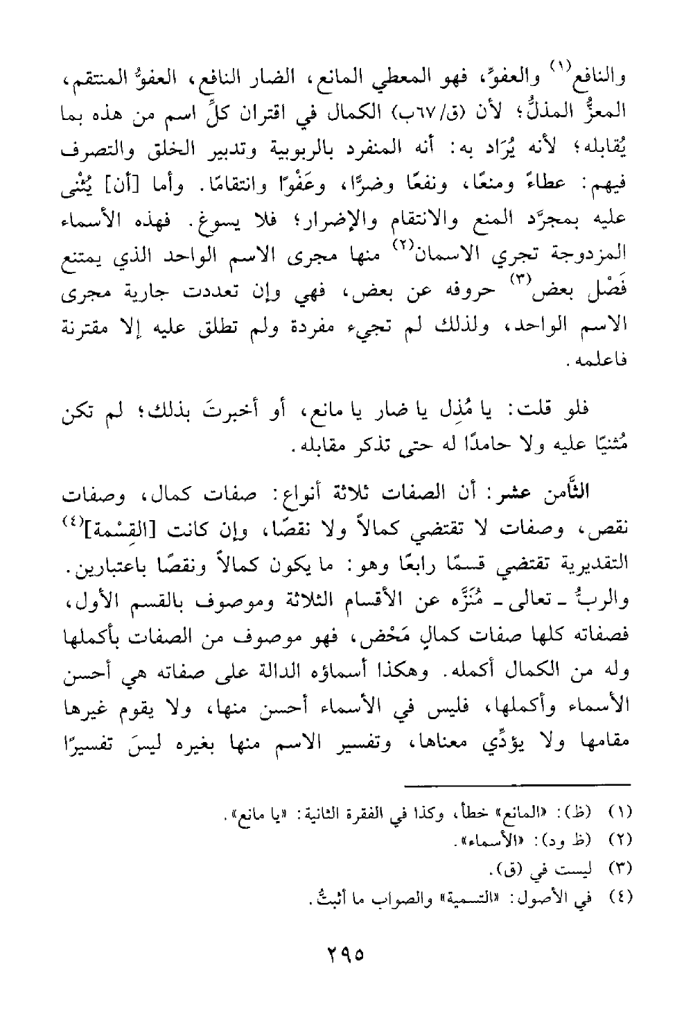 وأما أن يثنى عليه بمجرد المنع والإنتقام والإضرار فلا يسوغ فهذه الأسماء المزدوجة تجري الأسماء منها مجرى الإسم الواحد الذي يمتنع فصل بعض حروفه عن بعض فهي وإن تعددت جارية مجرى الإسم الواحد ولذلك لم تجيء مفردة ولم تطلق عليه إلا مقترنة فاعلمه