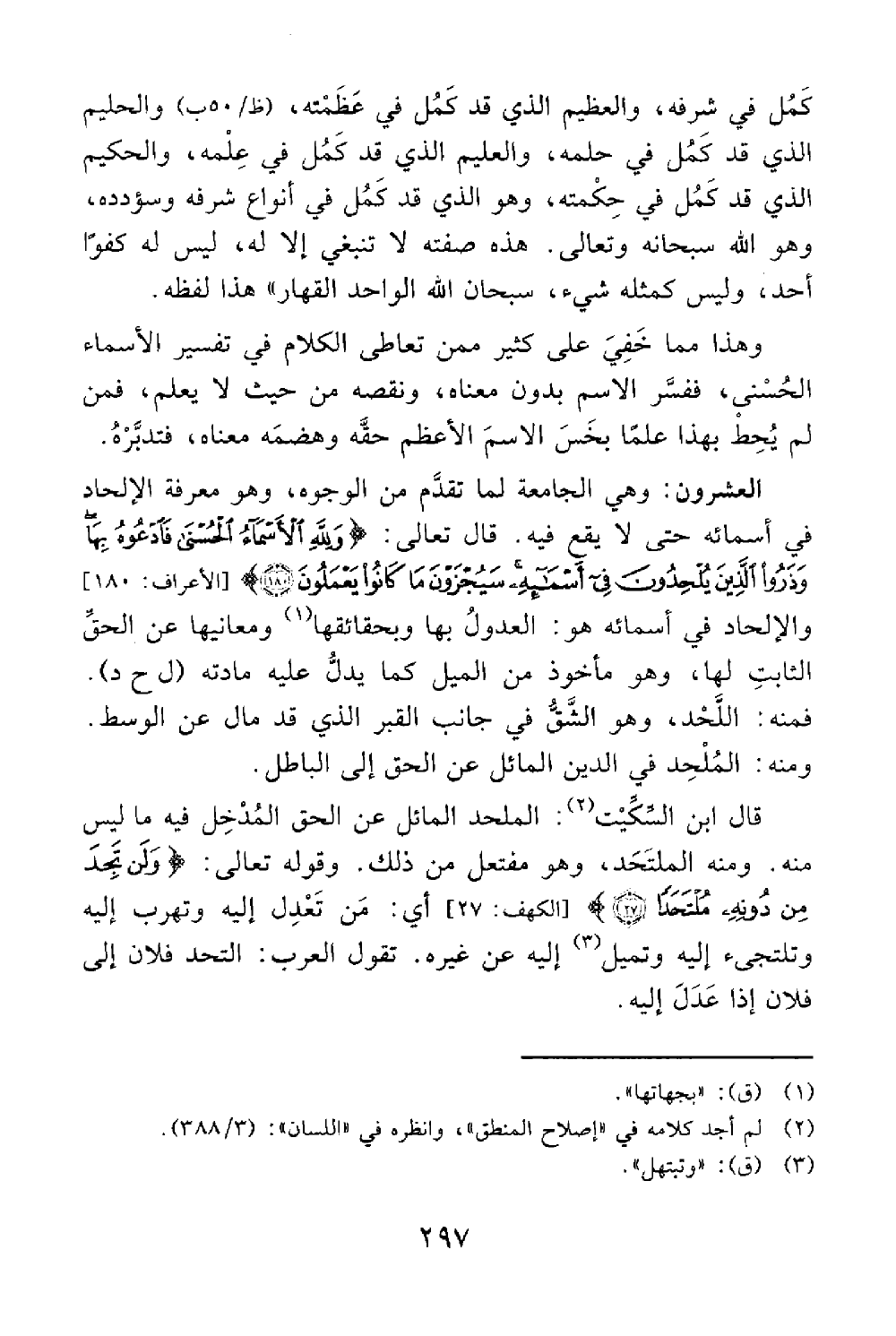 قال تعالى ولله الأسماء الحسنى فادعوه بها وذروا الذين يلحدون في أسمائه سيجزون ما كانوا يعلمون الأعراف 80 والإلحاد في أسمائه هو العدول بها وبحقائقها ومعانيها عن الحق الثابت لها وهو مأخوذ من الميل كما يدل عليه مادته ل ح د فمنه اللحد وهو الشق في جانب القبر الذي قد مال عن الوسط