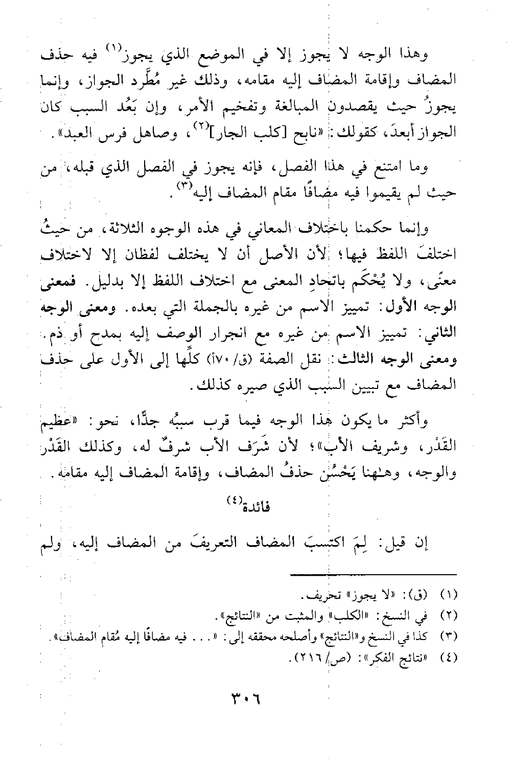 وعلى هذا الوجه لا يجوز إلا في الموضع الذي يجوز فيه حذف المضاف وإقامة المضاف إليه مقامه وذلك غير مطرد الجواز وإنما يجوز حيث يقصدون المبالغة وتفخيم الأمر وإن بعد النسب كان الجواز أبعد كقولك نابح الكلب وصاهل فرس العبد وما امتنع في هذا الفصل فإنه يجوز في الفصل الذي قبله منحيث لم يقيموا فيه مضافا مقام المضاف إليه وإنما حكمنا باختلاف المعاني في هذه الوجوه الثلاثة من حيث اختلف اللفظ فيها لأن الأصل أن لا يختلف لفظان إلا لاختلاف المعنى ولا يحكم باتحاد المعنى مع اختلاف اللفظ إلا بدليل