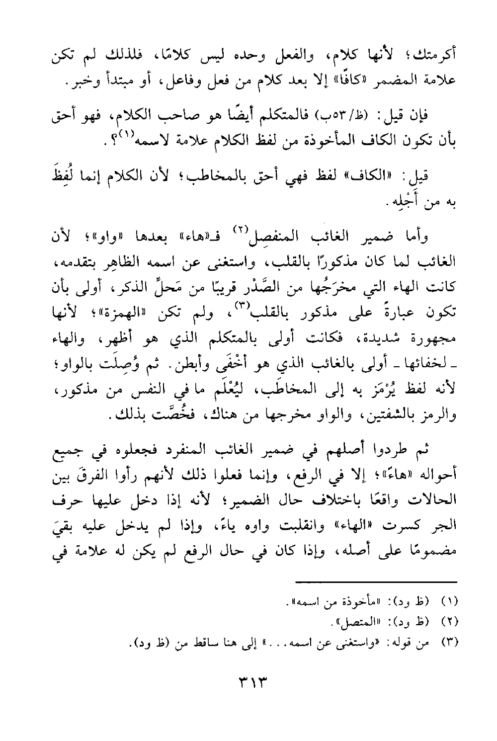 فإن قيل فالمتكلم ايضا هو صاحب الكلام فهو أحق بأن تكون الكاف المأخوذة من لفظ الكلام علامة للإسم