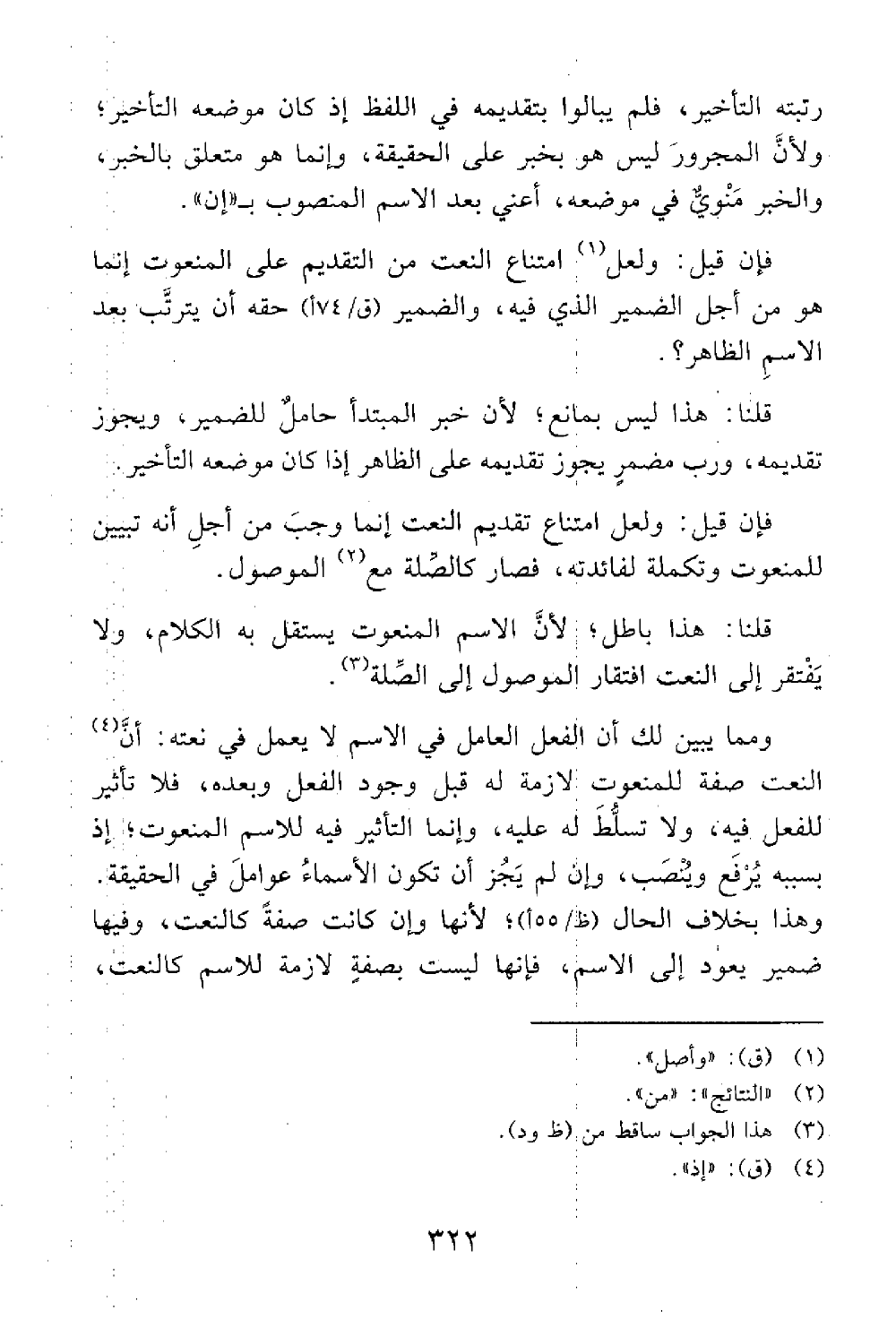 فإن قيل ولعل امتناع النعت من التقديم على المنعوت إنما هو من أجل الضمير الذي فيه والمضمر حقه أن يترتب بعد الإسم الظاهر