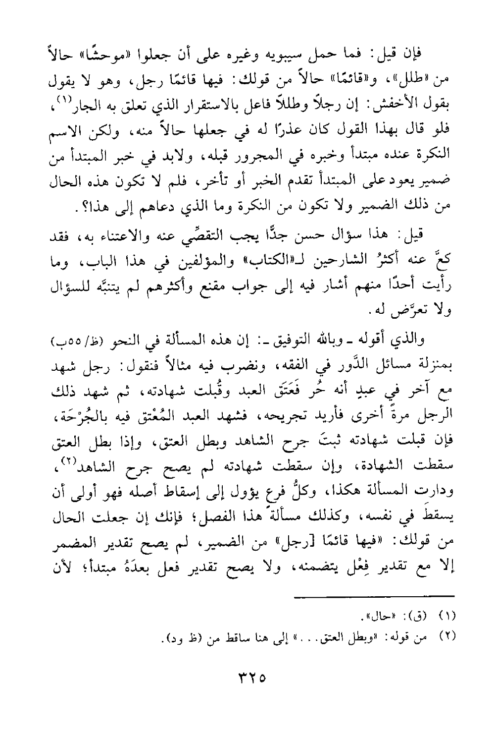 والذي أقوله وبالله التوفيق إن هذه المسألة في النحو بمنزلة مسائل الدور في الفقه ونضرب فيه مثالا فنقول رجل شهد مع آخر في عبد أنه حر فعتق العبد وقبلت شهادته ثم شهد ذلك الرجل مرة أخرى فأريد تجريحه فشهد العبد المعتق فيه بالجرحة فإن قبلت شهادته ثبت جرح الشاهد وبطل العتق وإذا بطل العتق سقطت الشهادة وإن سقطت شهادته لم يصح جرح الشاهد ودارت المسألة وهكذا