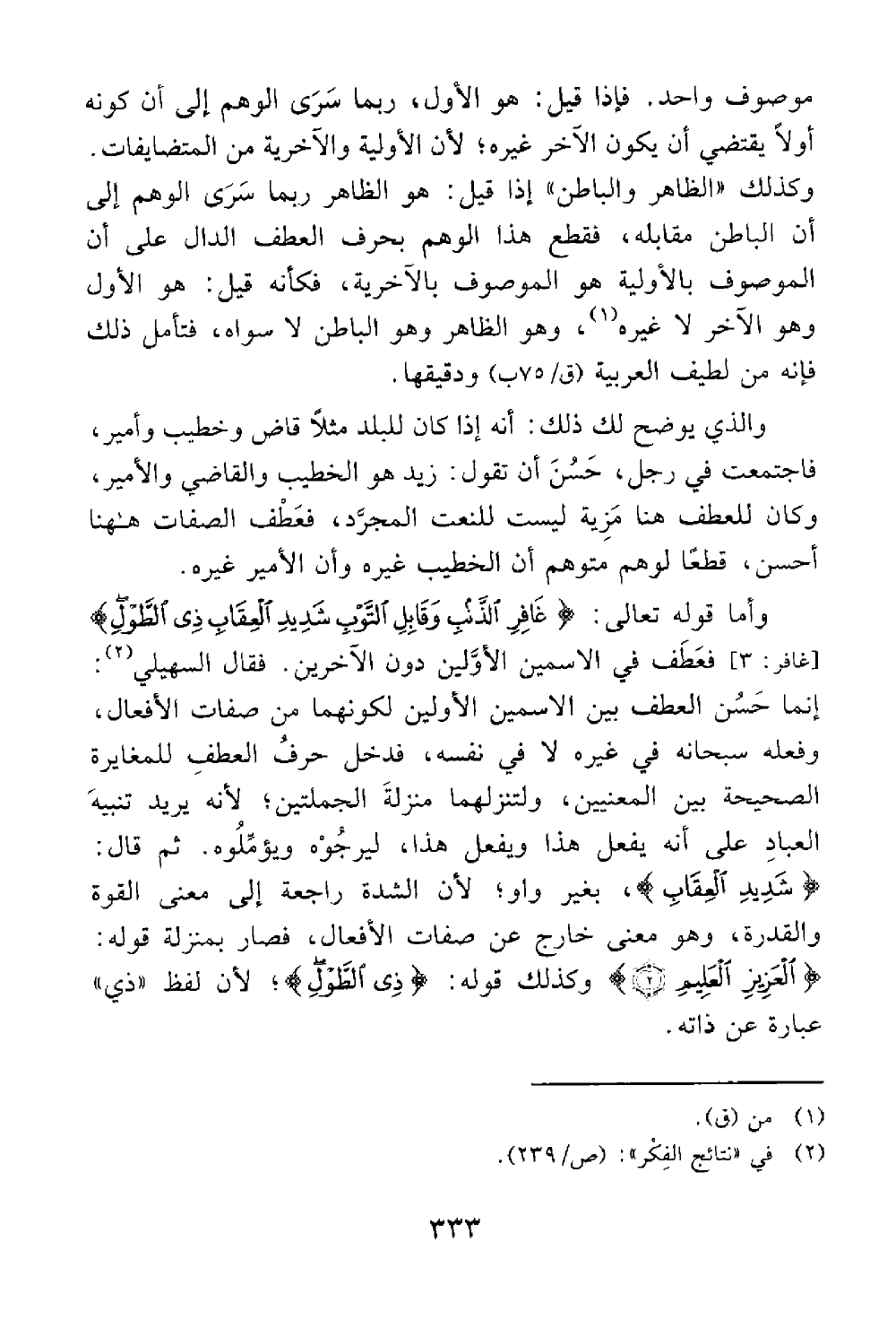 والذي يوضح لك ذلك أنه إذا كان للبلد مثلا قاض وخطيب وأمير فاجتمعت في رجل حسن أن تقول زيد هو الخطيب والقاضي والأمير وكان للعطف هنا مزية ليست للنعت المجرد فعطف الصفات ههنا أحسن قطعا لوهم متوهم أن الخطيب غيره وأن الأمير غيره وأما قوله تعالى غافر الذنب وقابل التوب شديد العقاب ذي الطول لا إله إلا هو غافر 3 فعطف في الإسمين الأولين دون الآخرين