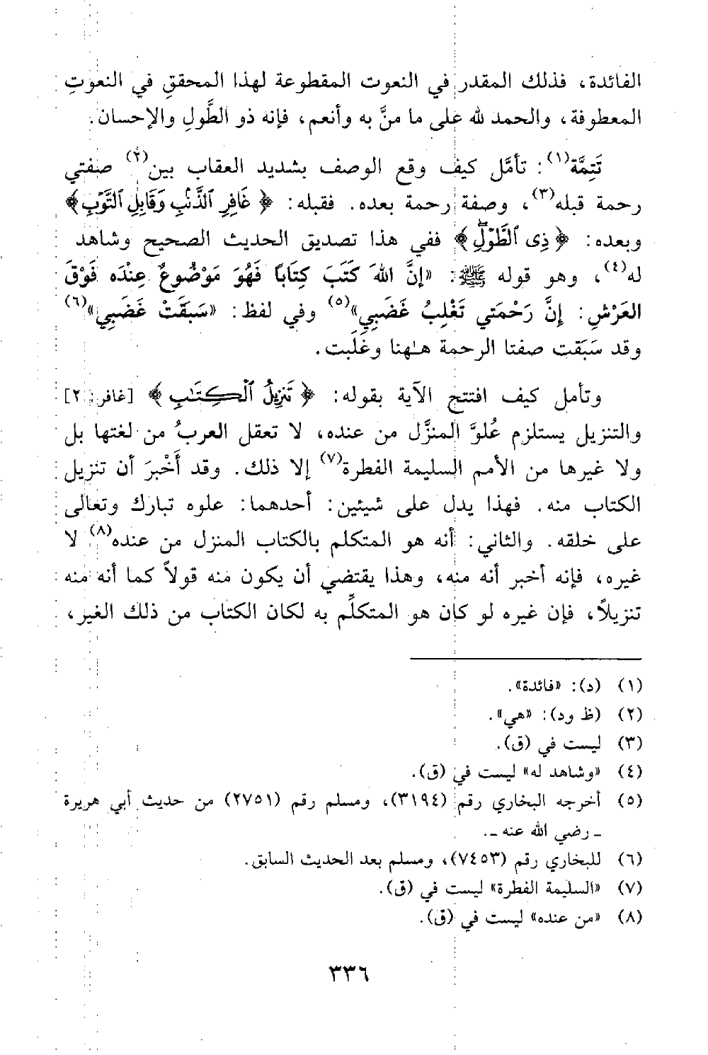 تتمة تأمل كيف وقع الوصف ب شديد العقاب بين صفة رحمة قبله وصفة رحمة بعده فقبله غافر الذنب وقابل التوب وبعده ذي الطول ففي هذا تصديق الحديث الصحيح وشاهد له وهو قوله إن الله كتب كتابا فهو موضوع عنده فوق العرش إن رحمتي تغلب غضبي // رواه البخاري ومسلم // وفي لفظ سبقت غضبي وقد سبقت صفة الرحمة هنا وغلبت