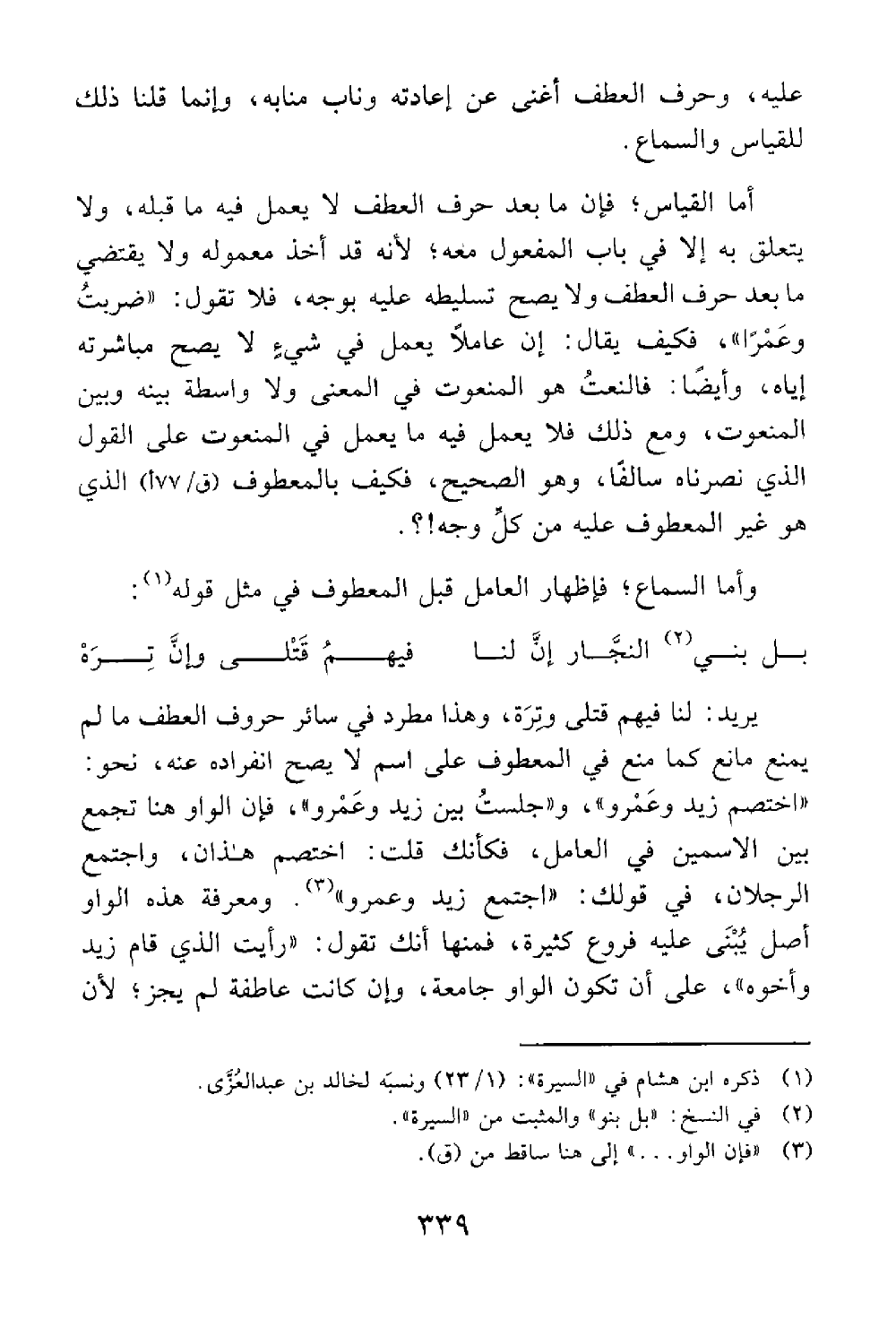 وأما السماع فإظهار العامل قبل المعطوف في مثل قوله بل بنو النجار إن لنا فيهم قتلى وإن تره يريد لنا فيهم قتلى وتره وهذا مطرد في سائر حروف العطف ما لم يمنع مانع كما منع في المعطوف على اسم لا يصح انفراده عنه نحو اختصم زيد وعمرو وجلست بين زيد وعمرو فإن الواو هنا تجمع بين الإسمين في العامل فكأنك قلت اختصم هذان واجتمع الرجلان في قولك اجتمع زيد وعمر الواو أصل تنبني عليه فروع