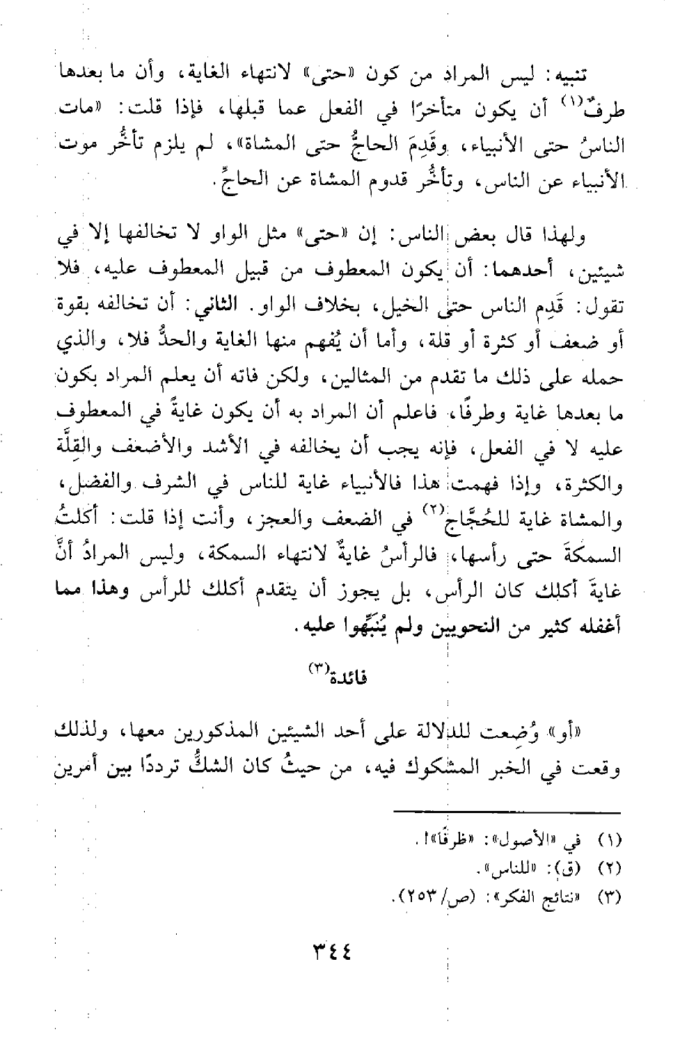 والذي حمله على ذلك ما تقدم من المثالين ولكن فاته أن يعلم المراد بكون ما بعدها غاية وظرفا فاعلم أن المراد به أن يكون غاية في المعطوف عليه لا في الفعل فإنه يجب أن يخالفه في الأشد والأضعف والقلة والكثرة وإذا فهمت هذا فالأنبياء غاية للناس في الشرف والفضل والمشاة غاية للحجاج في الضعف والعجز وأنت إذا قلت أكلت السمكة حتى رأسها فالرأس غاية لانتهاء السمكة وليس المراد أن غاية أكلك كان الرأس بل يجوز أن يتقدم أكلك للرأس وهذا مما أغفله كثير من النحويين لم ينبهوا عليه فائدة أو التردد بين شيئين