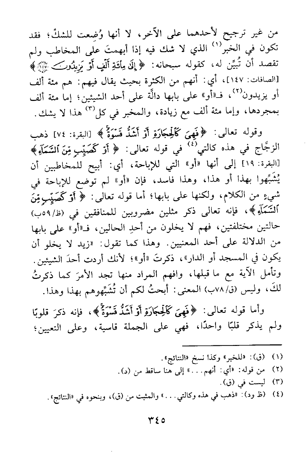 وقوله فهي كالحجارة أو أشد قسوة البقرة 74 ذهب في هذه الزجاج كالتي في قوله أو كصيب من السماء البقرة 19 إلى أنها أو التي للإباحة أي أبيح للمخاطبين أن يشبهوا بهذا أو هذا وهذا فاسد فإن أو لم توضع للإباحة في شيء من الكلام ولكنها على بابها أما قوله أو كصيب من السماء فإنه تعالى ذكر مثلين مضروبين للمنافقين في حالتين مختلفتين فهم لا يخلون من إحدى الحالتين ف أو على بابها من الدلالة على أحد المعنيين وهذا كما تقول زيد لا يخلو أن يكون في المسجد أو الدار ذكرت أو لأنك أردت أحد الشيئين وتأمل