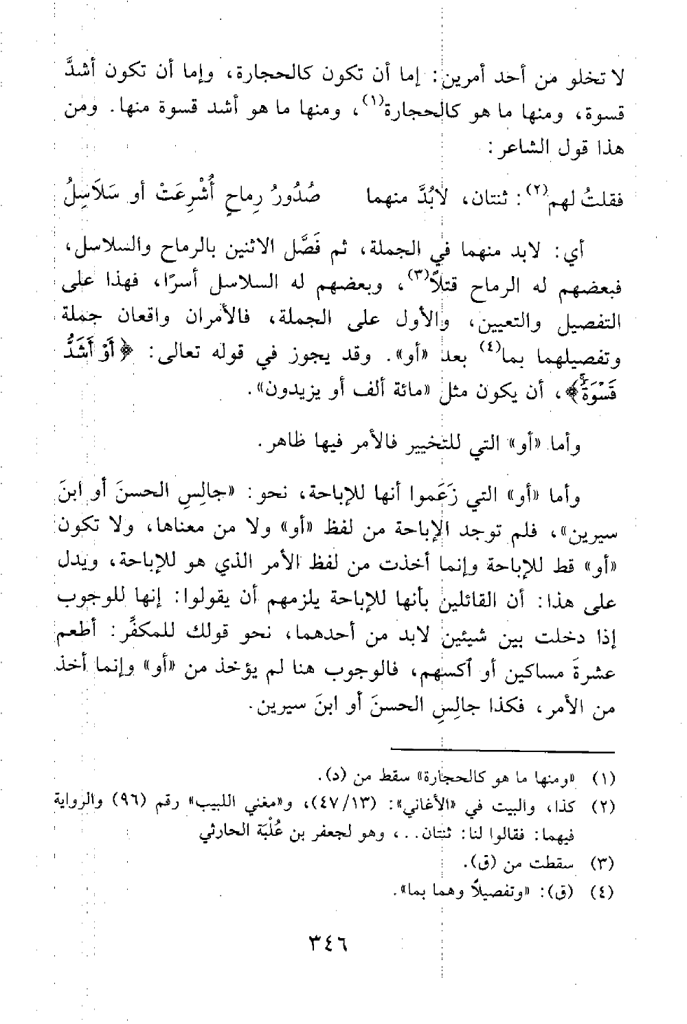 وأما أو التي للتخيير فالأمر فيها ظاهر وأما أو التي زعموا أنها للإباحة نحو جالس الحسن أو ابن سيرين فلم توجد الإباحة من لفظ أو ولا من معناها ولا تكون أو قط للإباحة وإنما أخذت من لفظ الأمر الذي هو للإباحة ويدل على هذا أن القائلين بأنها للإباحة يلزمهم أن يقولوا إنها للوجوب إذا دخلت بين شيئين لا بد من أحدهما نحو قولك للمكفر أطعم عشرة مساكين أو اكسهم فالوجوب هنا لم يوجد من أو وإنما أخذ من الأمر فكذا جالس الحسن أو ابن سيرين@