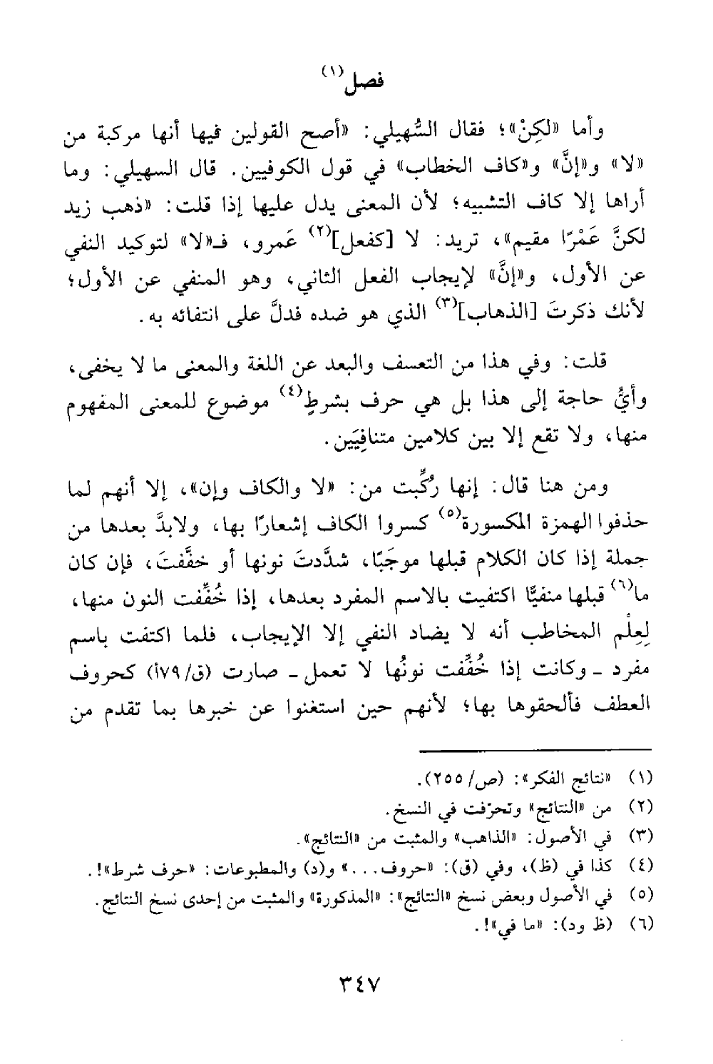 فصل لكن وأما لكن فقال السهيلي أصح القولين فيها أنها مركبة من لا وأن وكاف الخطاب في قول الكوفيين قال السهيلي وما أراها إلا كاف التشبيه لأن المعنى يدل عليها إذا قلت ذهب زيد لكن عمرو مقيم تريد لا ينتقل عمرو فلا لتوكيد النفي عن الأول وأن لا يجاب الفعل الثاني وهو النفي عن الأول لأنك ذكرت الذاهب الذي هو ضده فدل على انتفائه به