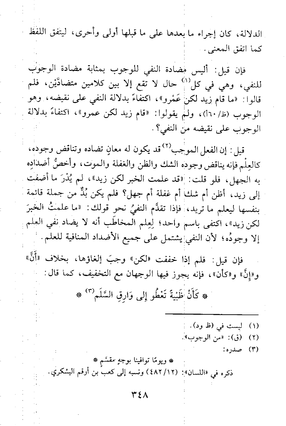 فإن قيل أليس مضادة النفي للوجوب بمثابة مضادة الوجوب للنفي وهي في كل حال لا تقع إلا بين كلامين متضادين فلم قالوا ما قام زيد لكن قام عمرو اكتفاء بدلالة النفي على نقيضه وهو الوجوب ولم يقولوا قام زيد لكن قام عمرو اكتفاء بدلالة الوجوب على نقيضه من النفي