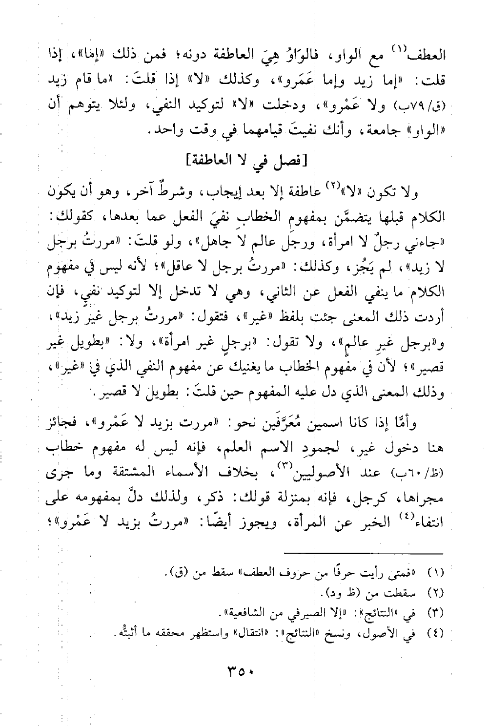 وشرط آخر وهو أن يكون الكلام قبلها يتضمن بمفهوم الخطاب نفي الفعل عما بعدها كقولك جاءني رجل لا امرأة ورجل عالم لا رجل جاهل ولو قلت مررت برجل لا زيد لم يجز وكذلك مررت برجل لا عاقل لأنه ليس في مفهوم الكلام ما ينفي الفعل عن الثاني وهي لا تدخل إلا لتوكيد نفي فإن أردت ذلك المعنى جئت بلفظ غير فتقول مررت برجل غير زيد ورجل غير عالم ولا تقول برجل غير امرأة ولا بطويل غير قصير لأن في مفهوم الخطاب ما يغنيك عن مفهوم النفي الذي في غير وذلك المعنى الذي دل عليه المفهوم حتى قلت بطويل لا قصير وأما إذا كانا اسمين معرفين نحو مررت بزيد لا عمرو فجائز هنا دخول غير لجمود الإسم العلم فإنه ليس له مفهوم خطاب عند الأصوليين بخلاف الأسماء المشتقة وما جرى مجراها كرجل فإنه بمنزلة قولك ذكر ولذلك دل بمفهومه على انتقال الخبر عن المرأة ويجوز أيضا مررت بزيد لا عمرو@