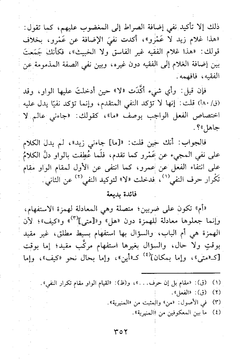 أم تكون على ضربين متصلة وهي المعادلة لهمزة الإستفهام وإنما جعلوها معادلة للهمزة دون هل ومتى وكيف لأن الهمزة هي أم الباب والسؤال بها استفهام بسيط مطلق غير مقيد بوقت ولا حال والسؤال بغيرها استفهام مركب مقيد إما بوقت ك متى وإما بمكان ك أين وإما بحال نحو كيف وإما @