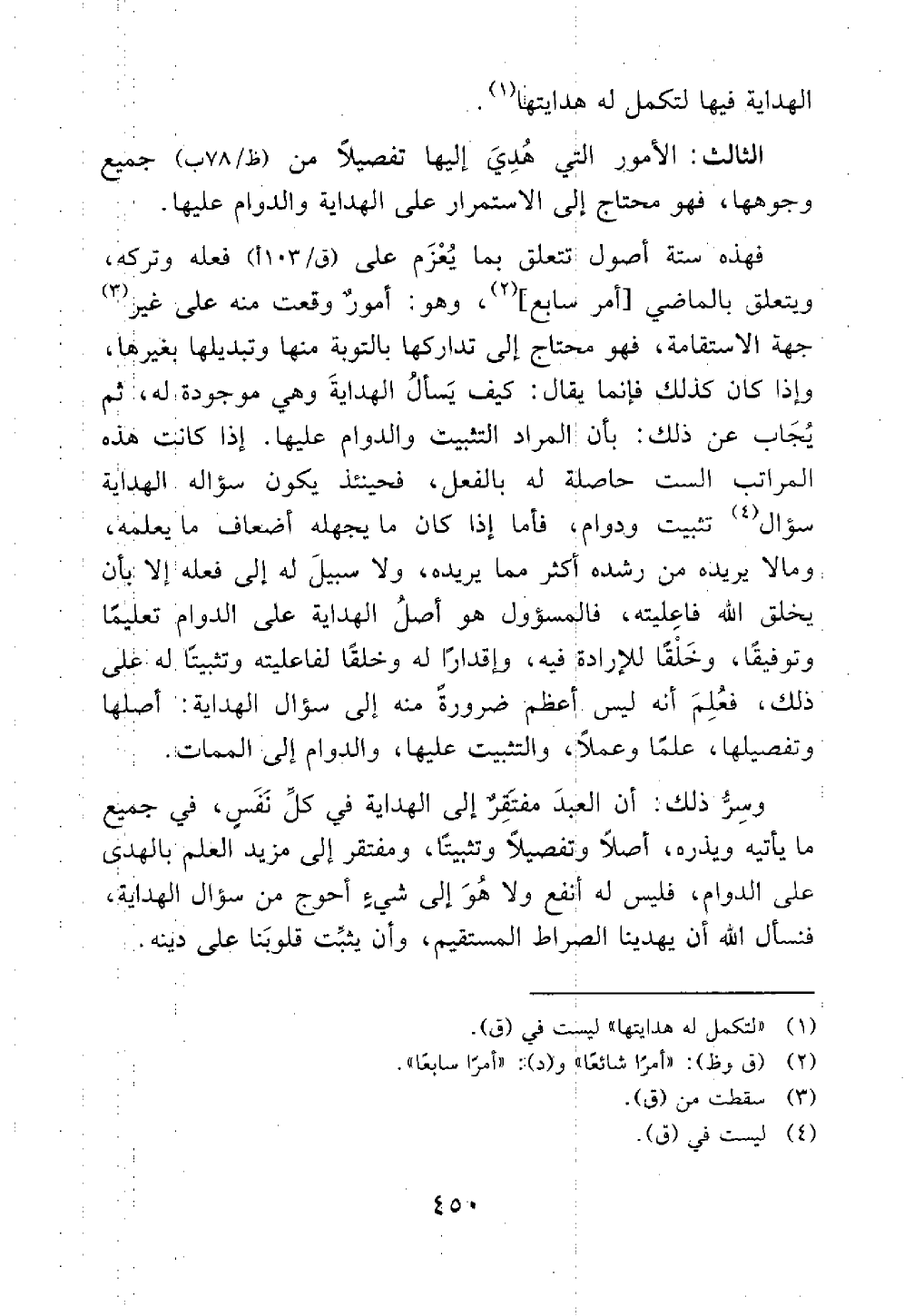 الثالث الأمور التي هدي إليها تفصيلا من جميع وجوهها فهو محتاج إلى الإستمرار إلى الهداية والدوام عليها فهذه أصول تتعلق بما يعزم على فعله وتركه