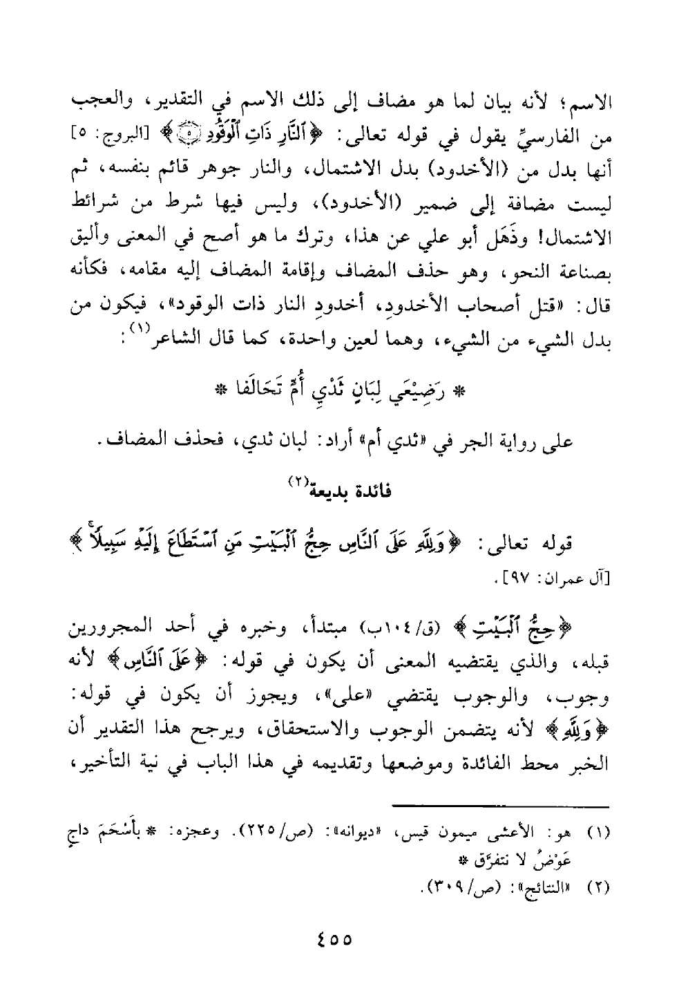 الإسم لأنه بيان لما هو مضاف إلى ذلك الإسم في التقدير والعجب من الفارسي يقول في قوله تعالى النار ذات الوقود البروج 5 أنها بدل من الأخدود بدل اشتمال والنار جوهر قائم بنفسه ثم ليست مضافة إلى ضمير الأخدود وليس فيها شرط من شرائط الإشتمال