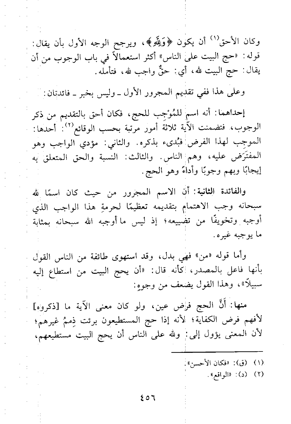 وكان الأحق أن يكون ولله ويرجح الوجه الأول بأن يقال قوله حج البيت على الناس أكثر استعمالا في باب الوجوب من أن يقال حج البيت لله تعالى أي حق واجب لله فتأمله