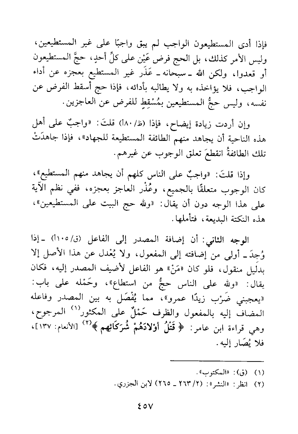 الوجه الثاني أن إضافة المصدر إلى الفاعل إذا وجد أولى من إضافته إلى المفعول ولا يعدل عن هذا الأصل إلا بدليل منقول فلو كان من هو الفاعل لأضيف المصدر إليه وكان يقال ولله على الناس حج البيت من استطاع وحمله على باب يعجبني ضرب زيدا عمرو مما يفصل به بين المصدر وفاعله المضاف إليه بالمفعول والظرف حمل على المكثور المرجوح وهي قراءة ابن عامر قتل أولادهم بفتح الدال شركائهم فلا يصار إليه @
