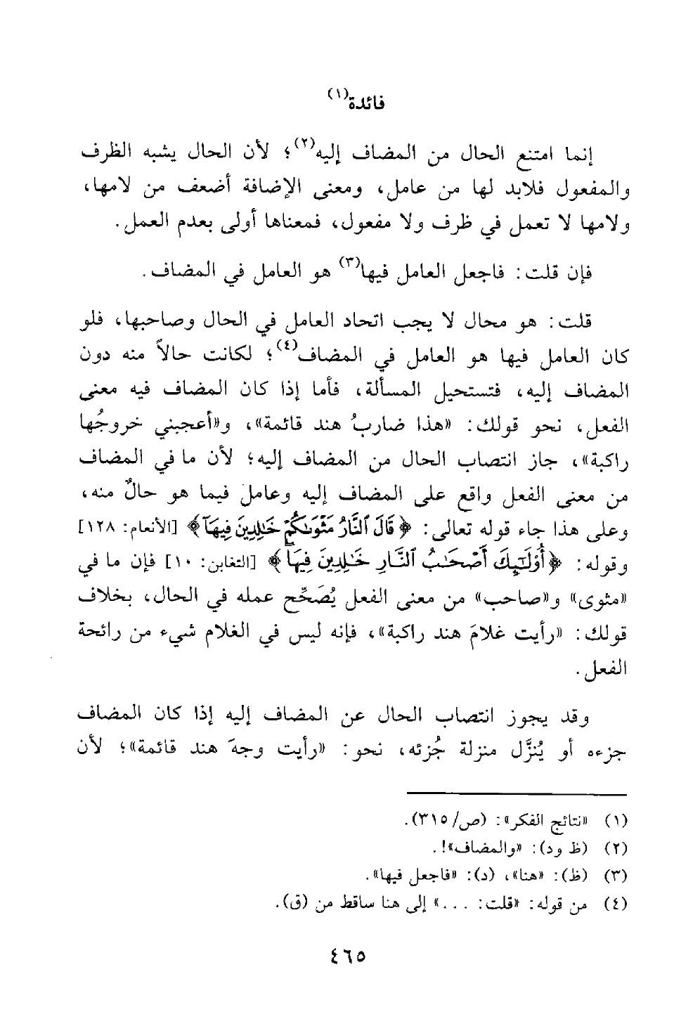 الفعل واقع على المضاف إليه وعامل فيما هو حال منه وعلى هذا جاء قوله تعالى قل النار مثواكم خالدين فيها الأنعام 128 وقوله أولئك أصحاب النار خالدين فيها التغابن 10 فإن ما في مثوى وأصحاب من معنى الفعل يصحح عمله في الحال بخلاف قولك رأيت غلام هند راكبة فإنه ليس في الغلام شيء من رائحة الفعل