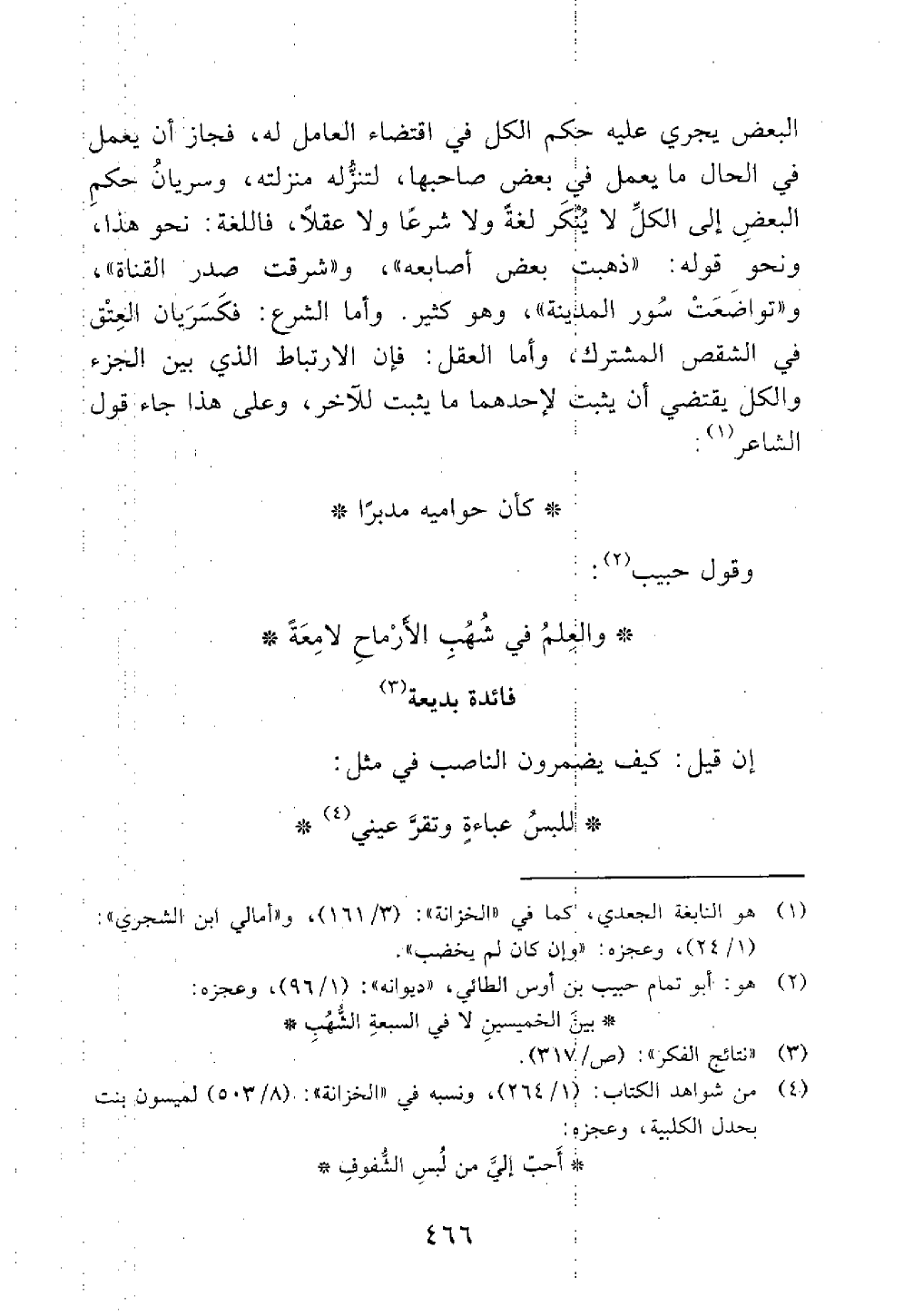 وأما الشرع فكسريان العتق في الشقص المشترك وأما العقل فإن الإرتباط الذي بين الجزء والكل يقتضي أن يثبت لأحدهما ما يثبت للآخر وعلى هذا جاء قول الشاعر