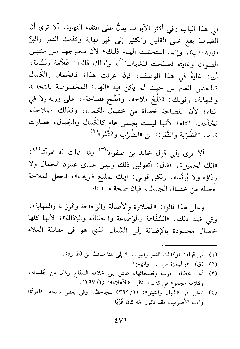 ألا ترى إلى قول خالد بن صفوان وقد قالت له امرأته إنك لجميل فقال أتقولين ذلك وليس عندي عمود الجمال ولا رداؤه ولا برنسه ولكن قولي إنك لمليح ظريف فجعل الملاحة خصلة من خصال الجمال فبان صحة ما قلناه