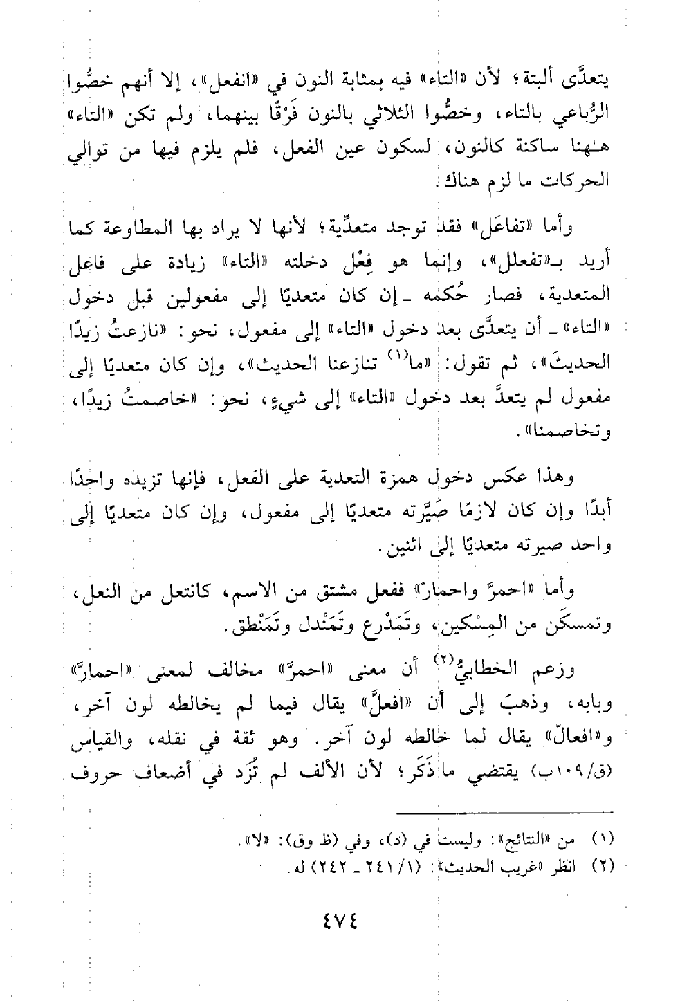 وأما احمر واحمار ففعل مشتق من الإسم كانتعل من النعل وتمسكن من المسكن وتمدرع وتمندل وتمنطق