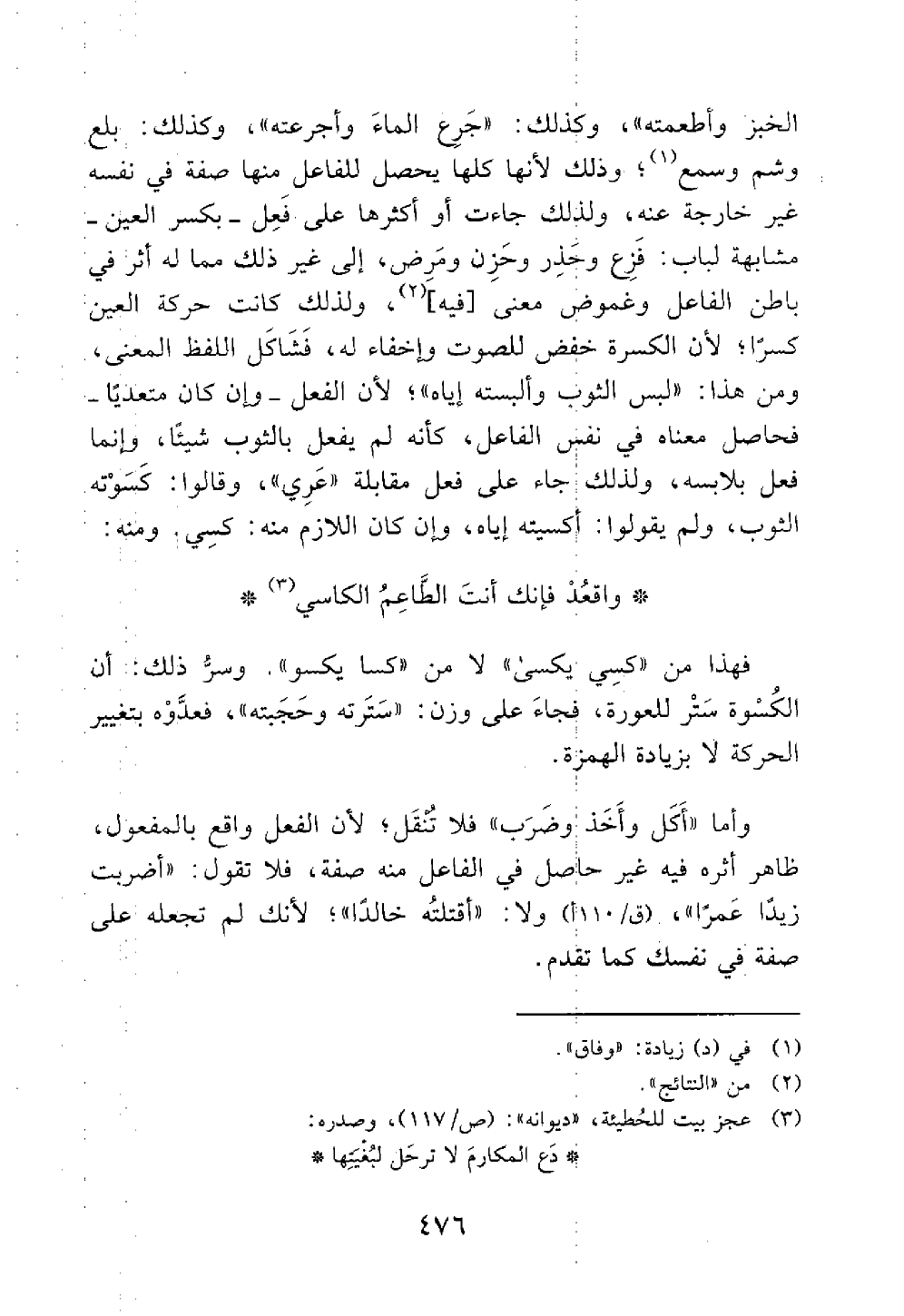 الخبز وأطعمته وكذلك جرع الماء وأجرعته وكذلك بلع وشم وسمع وذلك لأنها كلها تجعل في الفاعل منها صفة في نفسه غير خارجة عنه ولذلك جاءت أو أكثرها على فعل بكسر العين مشابهة لباب فزع وحذر وحزن ومرض إلى غير ذلك مما له أثر في باطن الفاعل وغموض معنى ولذلك كانت حركة العين كسرة لأن الكسرة خفض للصوت وإخفاء له فشاكل اللفظ المعنى