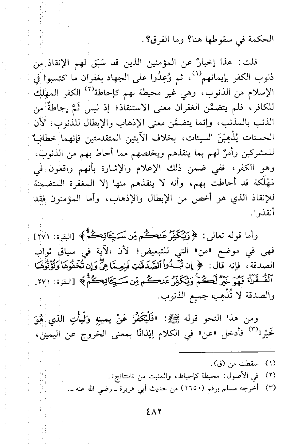 وأما المؤمنون فقد أنقذوا وأما قوله تعالى ويكفر عنكم من سيئاتكم البقرة 271 فهي في موضع من التي للتبعيض لأن الآية في سياق ثواب الصدقة فإنه قال إن تبدوا الصدقات فنعما هي وإن تخفوها وتؤتوها الفقراء فهو خير لكم ويكفر عنكم من سيئاتكم والصدقة لا تذهب جميع الذنوب