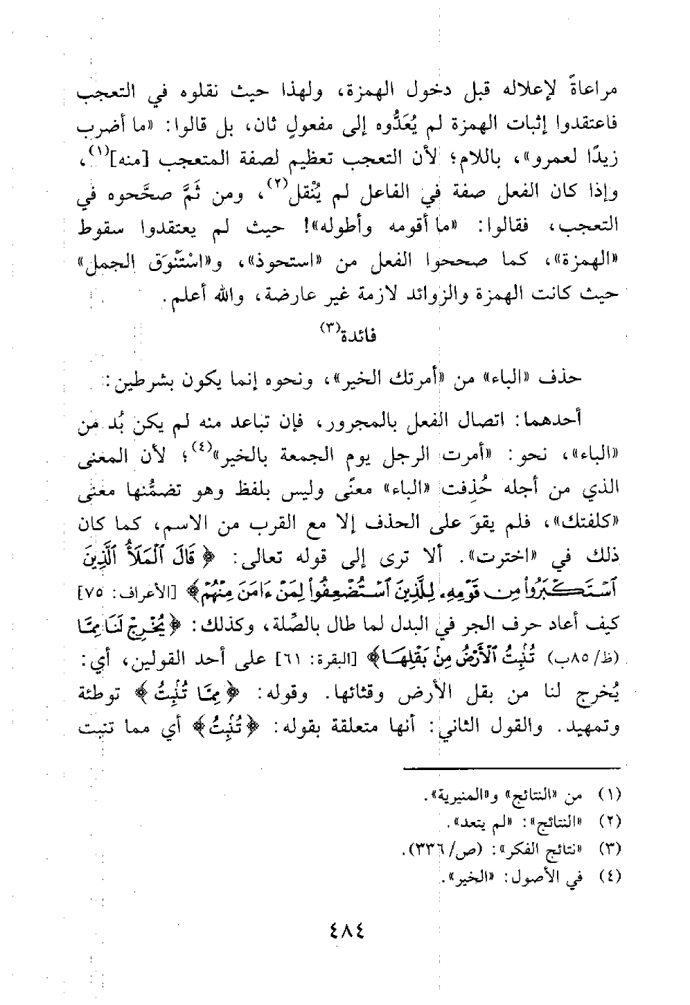 مراعاة لإعلاله قبل دخول الهمزة ولهذا حيث نقلوه في التعجب فاعتقدوا إثبات الهمزة لم يعدوه إلى مفعول ثان بل قالوا ما أضرب زيدا لعمرو باللام لأن التعجب تعظيم لصفة المتعجب منه وإذا كان الفعل صفة في الفاعل لم ينقل ومن ثم صححوه في التعجب فقالوا ما أقومه وأطوله حيث لم يعتقدوا سقوط الهمزة كما صححوا الفعل من استحوذ واستنوق الجمل حيث كانت الهمزة والزوائد لازمة غير عارضة والله أعلم فائدة حذف الباء من أمرتك الخير