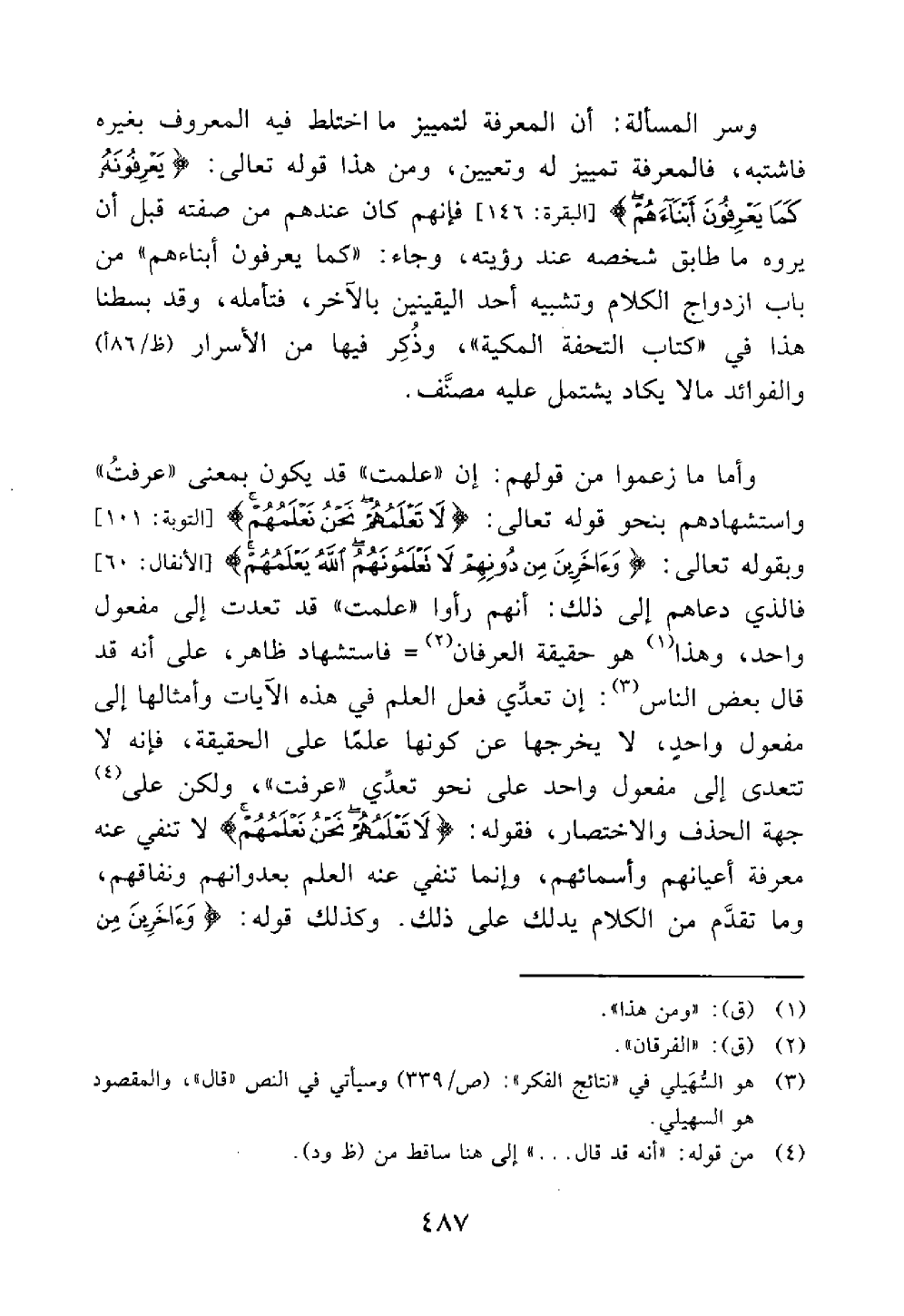 وسر المسألة أن المعرفة لتمييز ما اختلط فيه المعروف بغيره فاشتبه فالمعرفة تمييز له وتعيين ومن هذا قوله تعالى يعرفونه كما يعرفون أبناءهم البقرة 146 فإنهم كان عندهم من صفته قبل أن يروه ما طابق شخصه عند رؤيته وجاء كما يعرفون أبناءهم من باب ازدواج الكلام وتشبيه أحد اليقينين بالآخر فتأمله وقد بسطنا هذا في كتاب التحفة المكية وذكرنا فيها من الأسرار والفوائد ما لا يكاد يشتمل عليه مصنف