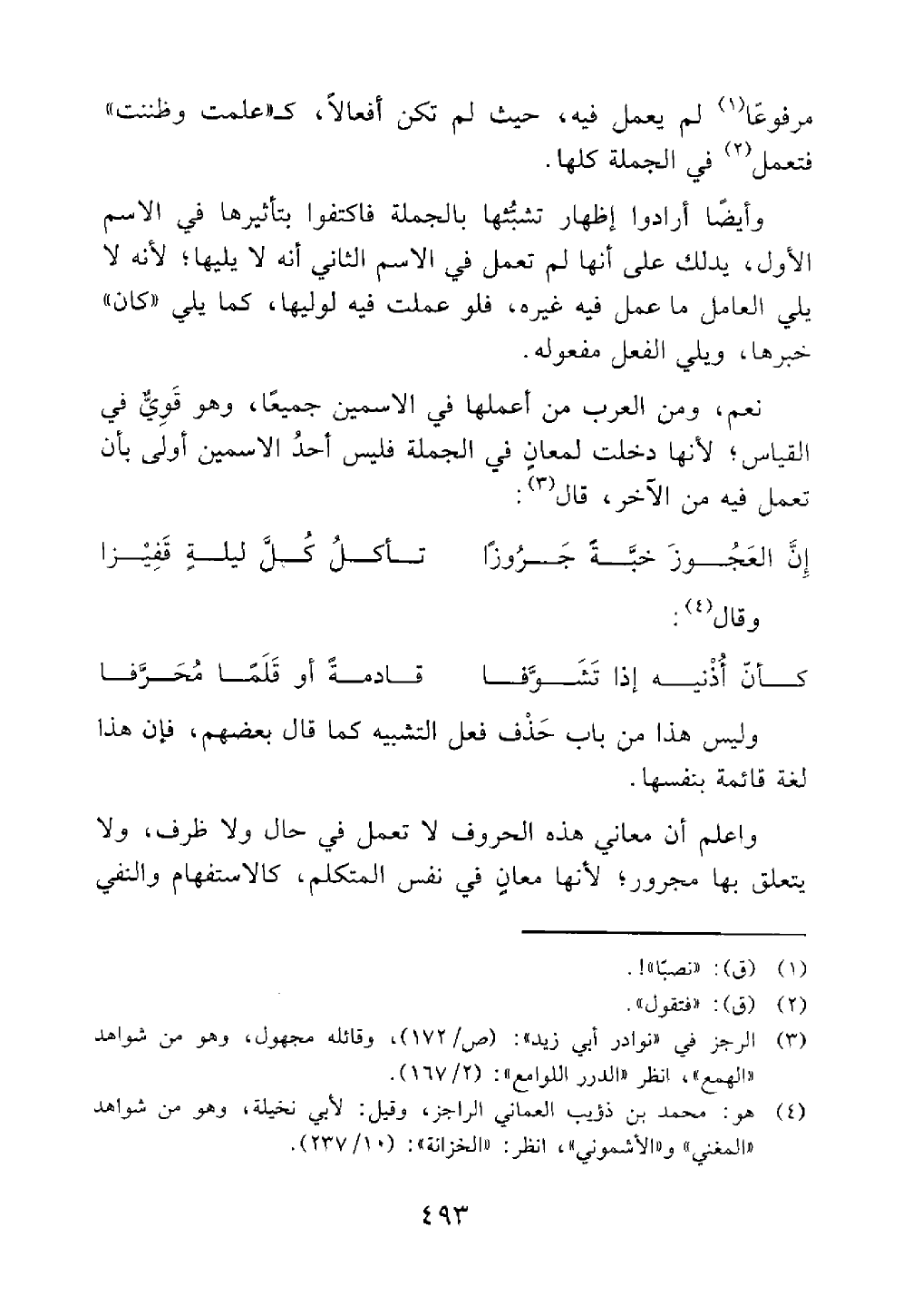 واعلم أن معاني هذه الحروف لا تعمل في حال ولا ظرف ولا يتعلق بها مجرور لأنها معان في نفس المتكلم كالإستفهام والنفي@