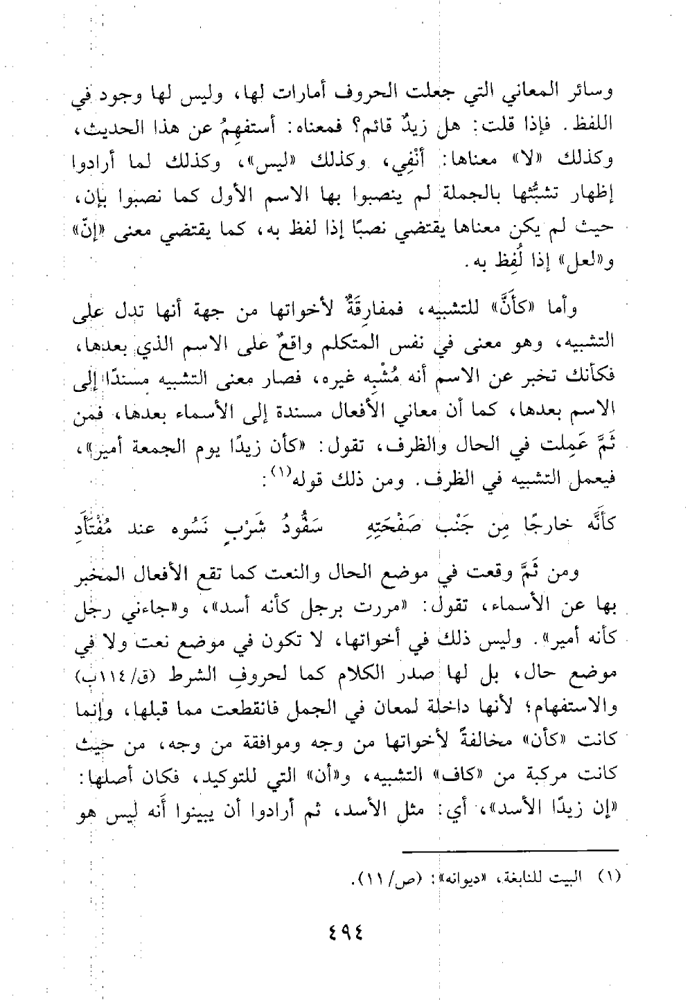 وليس ذلك في أخواتها لأنها لا تكون في موضع نعت ولا في موضع حال بل لها صدر الكلام كما لحروف الشرط والإستفهام لأنها داخلة لمعان في الجمل فانقطعت عما قبلها وإنما كانت كأن مخالفة لأخواتها من وجه وموافقة من وجه من حيث كانت مركبة من كاف التشبيه وأن التي للتوكيد وكان أصلها أن زيدا الأسد أي مثل الأسد ثم أرادوا أن يبينوا أنه ليس هو @