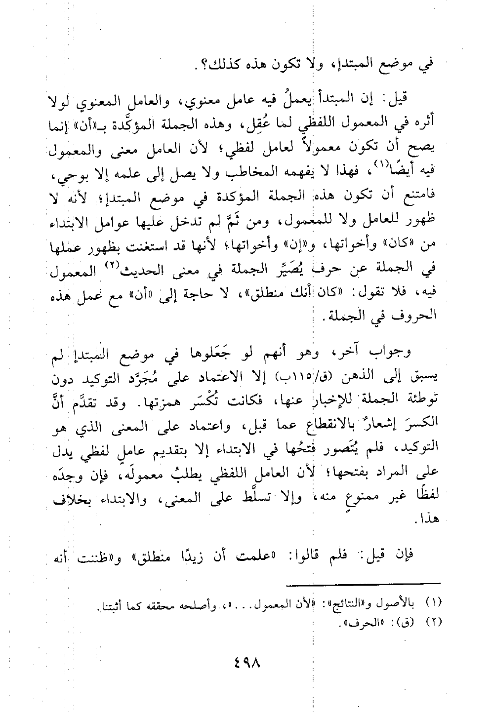 وهذه الجملة المؤكدة ب أن إنما يصح أن تكون معمولا لعامل لفظي لأن المعمول معنى أيضا فهذا لا يفهمه المخاطب ولا يصل إلى علمه إلا بوحي فامتنع أن تكون هذه الجملة المؤكدة في موضع المبتدأ لأنه لا ظهور للعامل ولا للمعمول ومن ثم لم تدخل عليه عوامل الإبتداء من كان وأخواتها وإن وأخواتها لأنها قد استغنت بظهور عملها في الجملة عن حرف يصير الجملة في معنى الحديث المعمول فيه فلا تقول كان أنك منطلق لا حاجة إلى أن مع عمل هذه الحروف في الجملة