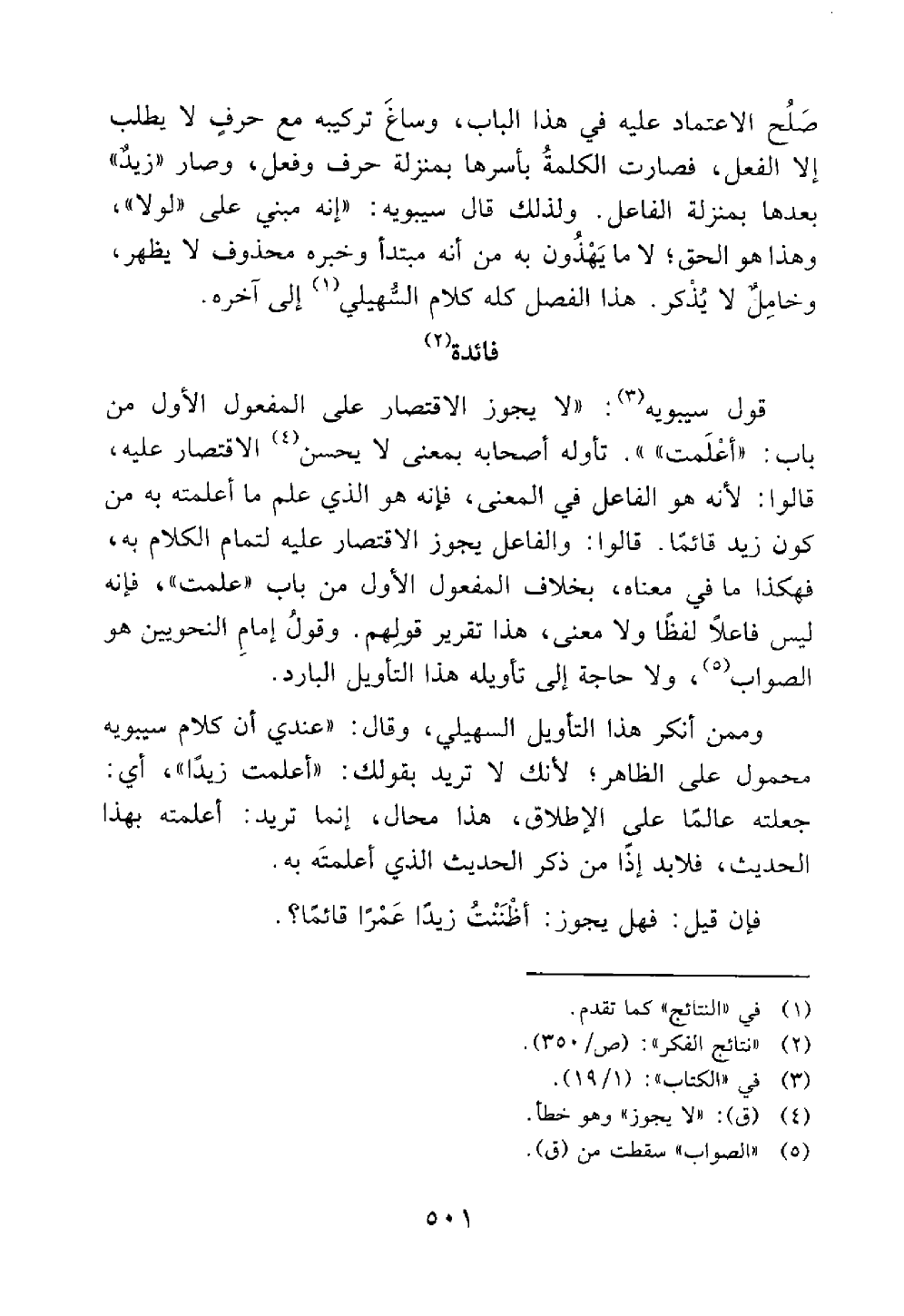 وممن أنكر هذا التأويل السهيلي وقال عندي أن قول سيبويه محمول على الظاهر لأنك لا تريد بقولك أعلمت زيدا أي جعلته عالما على الإطلاق هذا محال إنما تريد أعلمته بهذا الحديث فلا بد إذا من ذكر الحديث الذي أعلمته به