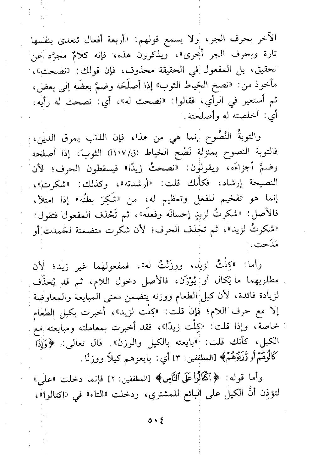 ثم استعير في الرأي فقالوا نصحت له أي نصحت له رأيه أي أخلصته وأصلحته له والتوبة النصوح إنما هي من هذا فإن الذنب يمزق الدين فالتوبة النصوح بمنزلة نصح الخياط الثوب إذا أصلحه وضم أجزاءه ويقولون نصحت زيدا فيسقطون الحرف لأن النصيحة إرشاد فكأنك قلت أرشدته وكذلك شكرت إنما هو تفخيم للفعل وتعظيم له من شكر بطنه إذا امتلأ فالأصل شكرت لزيد إحسانه وفعله ثم تحذف المفعول فتقول شكرت لزيد ثم تحذف الحرف لأن شكرت متضمنة لحمدت أو مدحت وأما كلت لزيد ووزنت له فمفعولهما غير زيد لأن مطلوبها ما يكال أو يوزن فالأصل دخول اللام ثم قد يحذف لزيادة فائدة لأن كيل الطعام ووزنه يتضمن معنى المبايعة والمقاوضة إلا مع حرف اللام فإن قلت كلت لزيد أخبرت بكيل الطعام خاصة وإذا قلت كلت زيدا فقد أخبرت بمعاملته ومبايعته مع الكيل كأنك قلت بايعته بالكيل والوزن