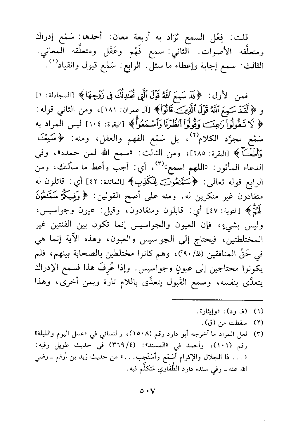قلت فعل السمع يراد به أربعة معان أحدهما سمع إدراك ومتعلقه الأصوات