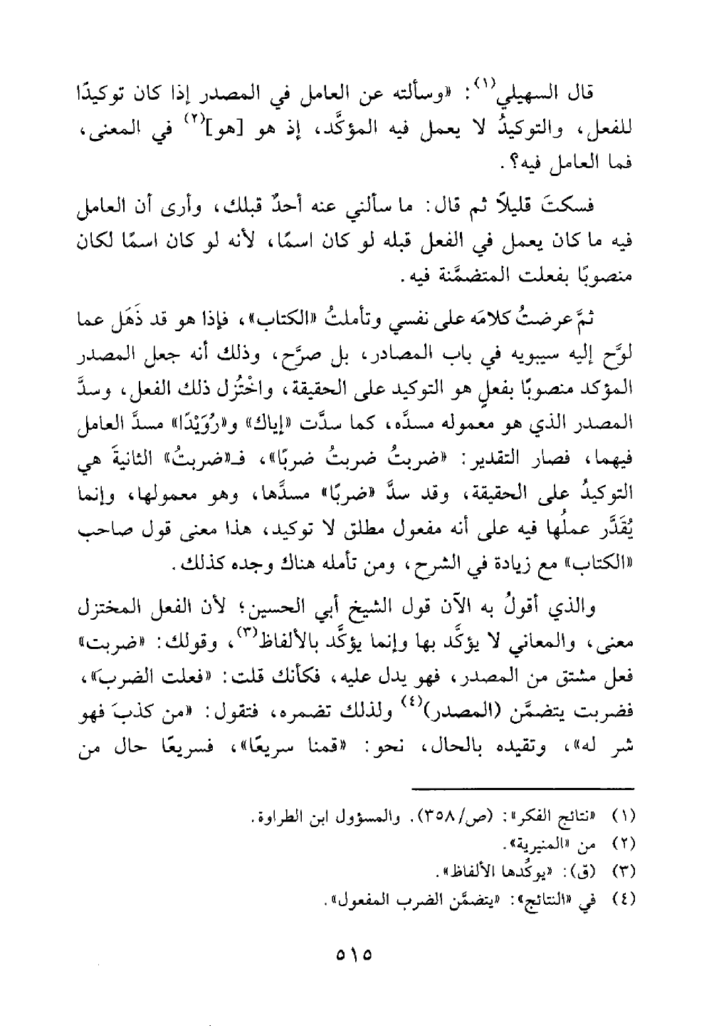 قال السهيلي وسألته عن العامل في المصدر إذا كان توكيدا للفعل والتوكيد لا يعمل فيه المؤكد إذ هو هو في المعنى فما العامل فيه فسكت قليلا ثم قال ما سألني عنه أحد قبلك وأرى أن العامل فيه ما كان يعمل في الفعل قبله لو كان اسما لأنه لو كان اسما لكان منصوبا بفعلت المتضمنة فيه