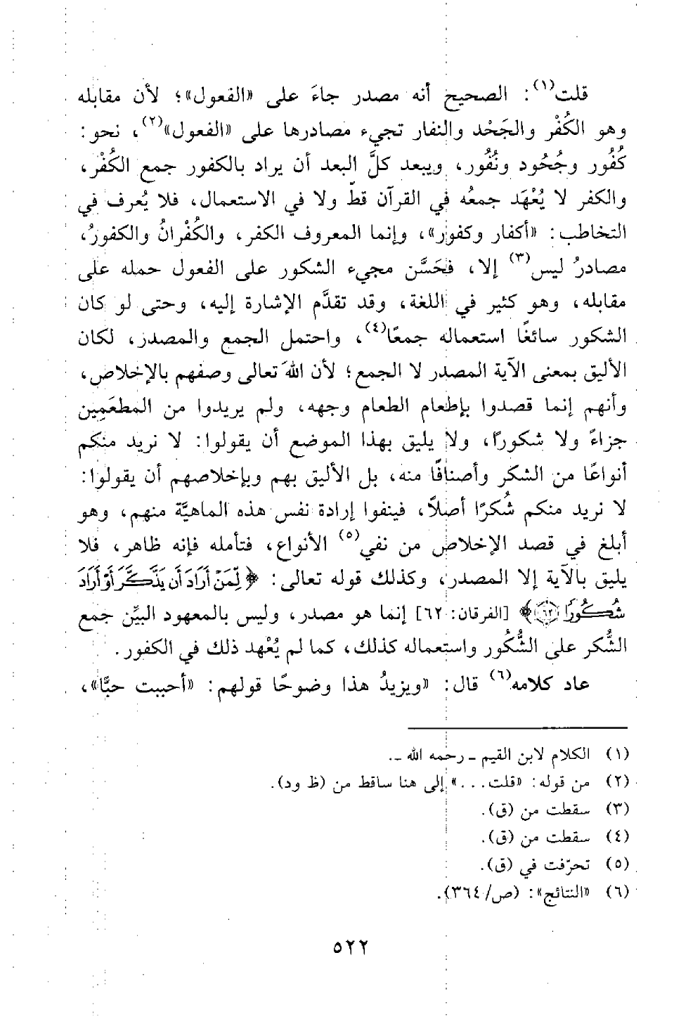ولا يليق بهذا الموضع أن يقول لا نريد منكم أنواعا من الشكر وأصنافا منه بل الأليق بهم وبإخلاصهم أن يقولوا لا نريد منكم شكرا أصلا فينفوا إرادة نفس هذه الماهية منهم وهو أبلغ في قصد الإخلاص من نفي الأنواع فتأمله فإنه ظاهر فلا يليق بالآية إلا المصدر وكذلك قوله تعالى لمن أراد أن يذكر أو أراد شكورا إنما هو مصدر وليس بالمعهود البين جمع الشكر على الشكور واستعماله كذلك كما لو لم يعهد ذلك في الكفور