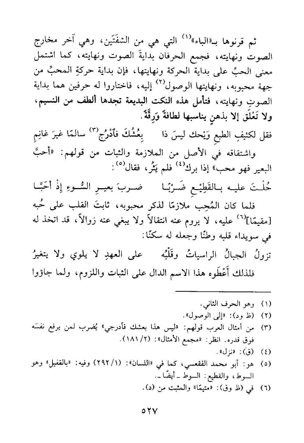 ثم قرنوها بالباء التي هي من الشفتين وهي آخر مخارج الصوت ونهايته فجمع الحرفان بداية الصوت ونهايته كما اشتمل معنى الحب على بداية الحركة ونهايتها فإن بداية حركة المحب من جهة محبوبه ونهايتها إلى الوصول إليه فاختاروا له حرفين هما بداية الصوت ونهايته فتأمل هذه النكت البديعة تجدها ألطف من النسيم ولا تعلق إلا بذهن يناسبها لطافة ورقة