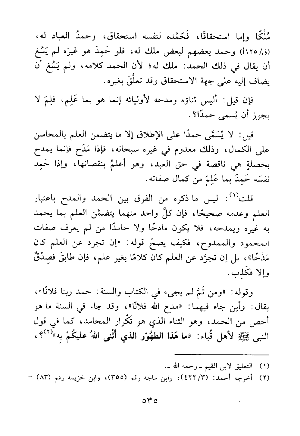 وقد جاء في السنة ما هو أخص من الحمد وهو الثناء الذي هو تكرار المحامد كما في قول النبي لأهل قباء ما هذا الطهور الذي أثنى الله عليكم به@