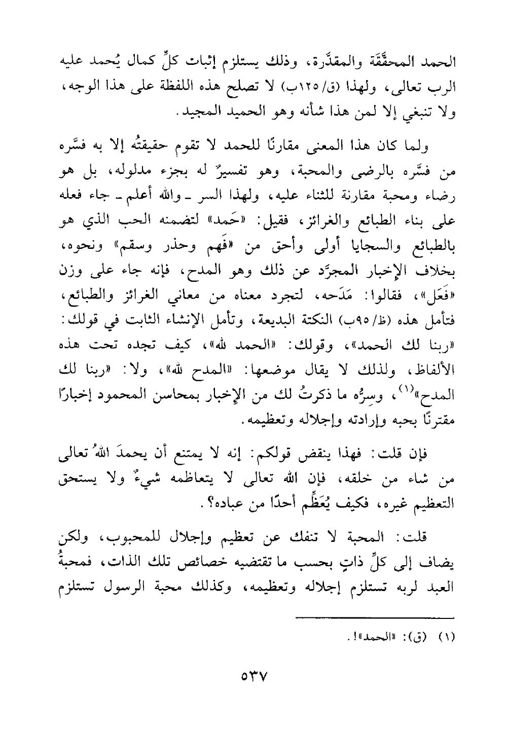 ولما كان هذا المعنى مقارنا للحمد لا تتقوم حقيقته إلا به فسره من فسره بالرضى والمحبة وهو تفسير له بجزء مدلوله بل هو رضاء ومحبة ومقارنة للثناء