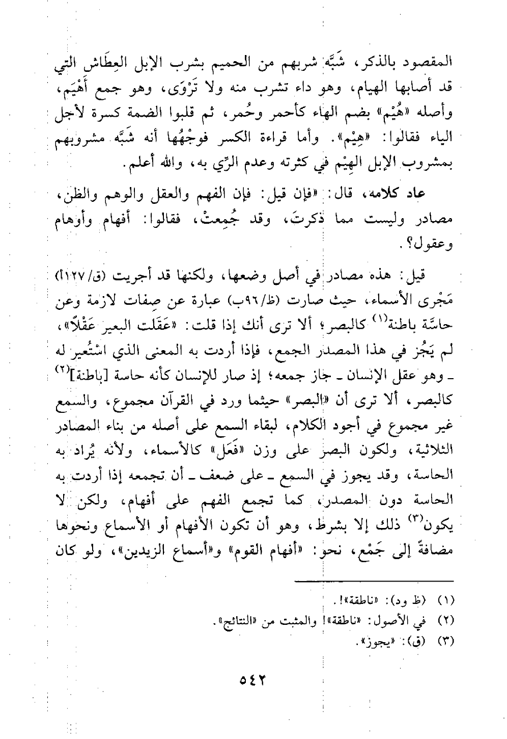 ألا ترى أنك إذا قلت عقلت البعير عقلا لم يجز في هذا المصدر الجمع فإذا أردت به المعنى الذي استعير له وهو عقل الإنسان جاز جمعه إذ صار للإنسان كأنه حاسة ناطقة كالبصر