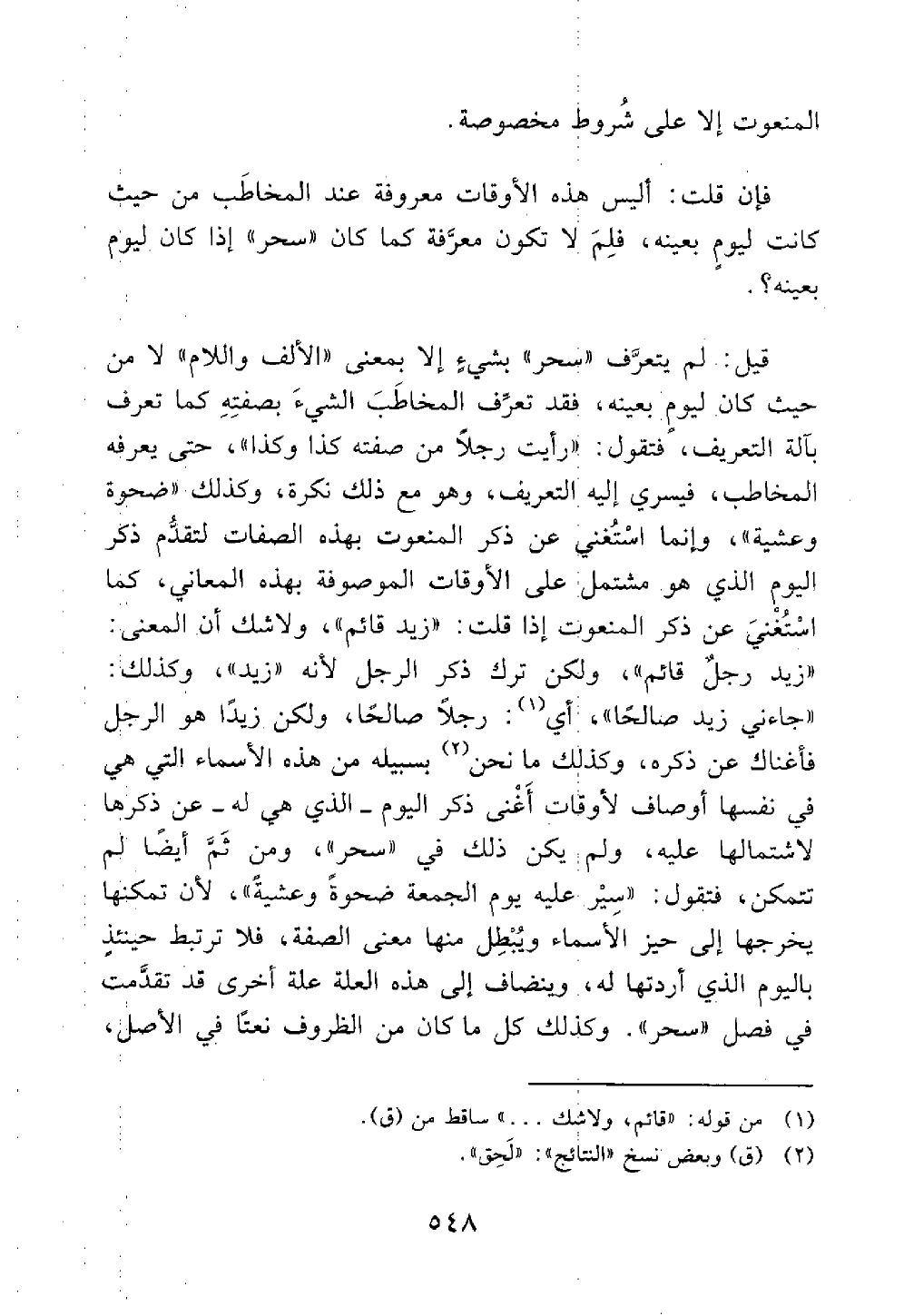فإن قلت أليست هذه الأوقات معروفة عند المخاطب من حيث كانت ليوم بعينه فلم لا تكون معرفة كما كان سحر إذا كان ليوم بعينه
