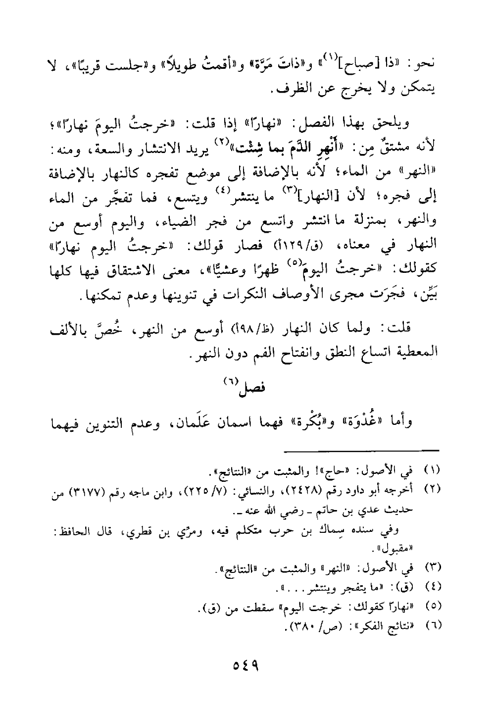 طويلا وجلست قريبا لا يتمكن ولا يخرج من الظرف ويلحق بهذا الفصل نهارا إذا قلت خرجت اليوم نهارا لأنه مشتق من أنهر الدم بما تشتت تريد الإنتشار والسعة ومنه النهر من الماء لأنه بالإضافة إلى موضع تفجره كالنهار بالإضافة إلى فجره لأن النهر ما ينتشر ويتسع فما انفجر من الماء والنهر بمنزلة ما انتشر واتسع من فجر الضياء واليوم أوسع من النهار في معناه فصار قولك خرجت اليوم نهارا كقولك خرجت اليوم ظهرا وعشيا معنى الإشتقاق فيها كلها بين فجرت مجرى الأوصاف للنكرات في تنوينها وعدم تمكنها
