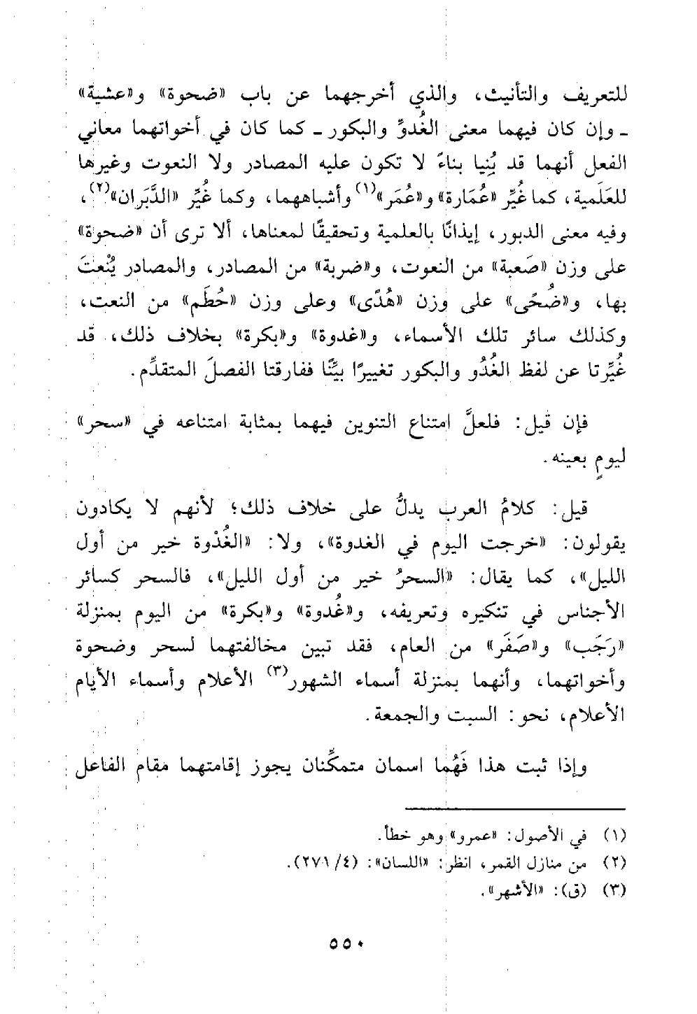 قيل كلام العرب يدل على خلاف ذلك لأنهم لا يكادون يقولون خرجت اليوم في الغدوة وللغدوة خير من أول الليل كما يقال السحر خير من أول الليل فالسحر كسائر الأجناس في تنكيره وتعريفه وغدوة وبكرة من اليوم بمنزلة رجب وصفر من العام فقد تبين مخالفتهما لسحر وضحوة وأخواتهما وأنهما بمنزلة أسماء الشهور