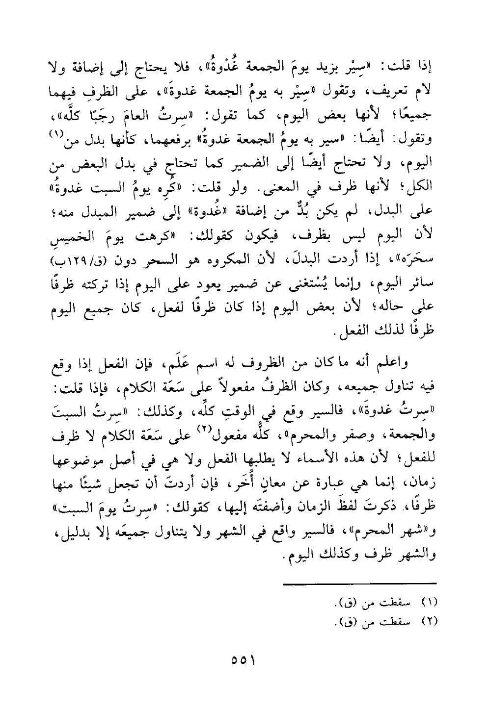 واعلم أنه ما كان من الظروف له اسم علم فإن الفعل إذا وقع فيه تناول جميعه وكان الظرف مفعولا على سعة الكلام فإذا قلت سرت غدوة فالسير وقع في الوقت كله وكذلك سرت السبت والجمعة وصفر والمحرم كله مفعول على سعة الكلام لا ظرف للفعل لأن هذه الأسماء لا يطلبها الفعل ولا هي في أصل موضوعها زمان إنما هي عبارة عن معان أخرى فإن أردت أن تجعل شيئا منها ظرفا ذكرت لفظ الزمان وأضفته إليه كقولك سرت يوم السبت وشهر المحرم فالسير واقع في الشهر ولا يتناول جميعه إلا بدليل والشهر ظرف وكذلك اليوم@