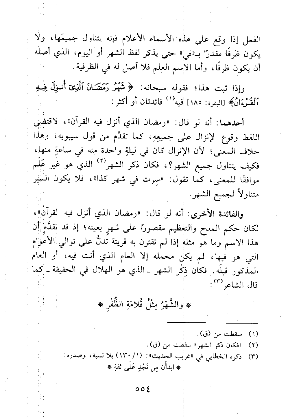 الفعل إذا وقع على هذه الأسماء الأعلام فإنه يتناول جميعها ولا يكون ظرفا مقدرا ب في حتى يذكر لفظ الشهر أو اليوم الذي أصله أن يكون ظرفا وأما الإسم العلم فلا أصل له في الظرفية وإذا ثبت هذا فقول الله سبحانه شهر رمضان الذي أنزل فيه القرآن فيه فائدتان أو أكثر