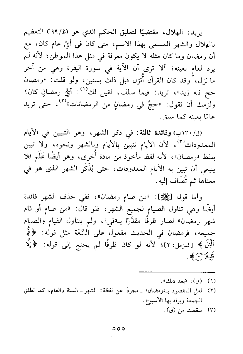 وأما قوله من صام رمضان ففي حذف الشهر فائدة أيضا وهي تناول الصيام لجميع الشهر فلو قال من صام أو قام شهر رمضان لصار ظرفا مقدرا ب في ولم يتناول القيام والصيام جميعه فرمضان في الحديث مفعول على السعة نحو قوله قم الليل المزمل 2 لأنه لو كان ظرفا لم يحتج إلى قوله إلا قليلا@