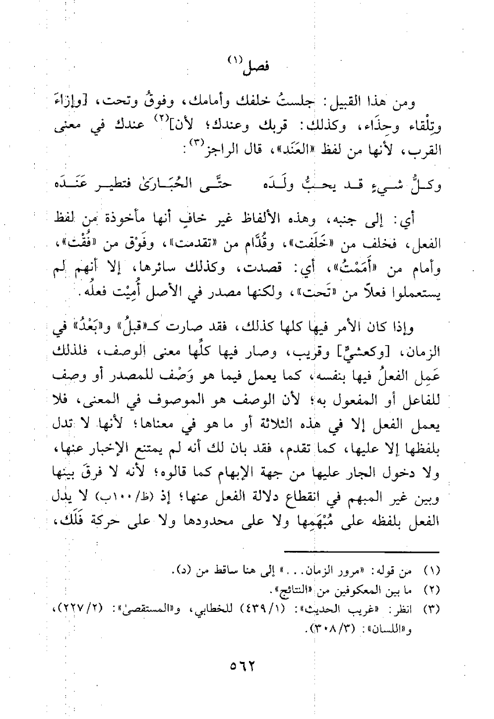 إلا أنهم لم يستعملوا فعلا من تحت ولكنها مصدر في الأصل أميت فعله وإذا كان الأمر فيها كذلك فقد صارت كقبل وبعد في الزمان وقريب وصار فيها كلها معنى الوصف فلذلك عمل الفعل فيها بنفسه كما يعمل فيما هو وصف للمصدر أو وصف للفاعل أو المفعول به لأن الوصف هو الموصوف في المعنى فلا يعمل الفعل إلا في هذه الثلاثة أو ما هو في معناها لأنها لا تدل بلفظها إلا عليها كما تقدم فقد بان لك أنه لم يمتنع الإخبار عنها ولا دخول الجار عليها من جهة الإبهام كما قالوه لأنه لا فرق بينهما وبين غير المبهم في انقطاع دلالة الفعل عنها إذ لا يدل الفعل بلفظه على مبهمها ولا على محدودها ولا على حركة فلك@