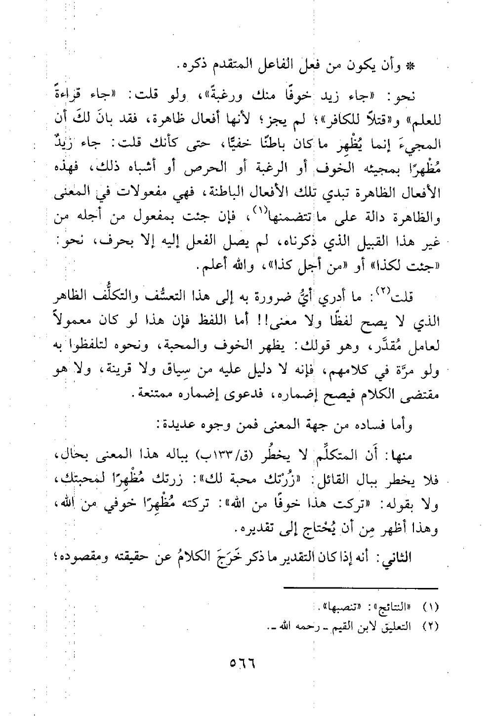 منها أن المتكلم لا يخطر بباله هذا المعنى بحال فلا يخطر ببال القائل زرتك محبة لك وزرتك مظهرا لمحبتك ولا بقوله تركت هذا خوفا من الله تركته مظهرا خوفي من الله وهذا أظهر من أن يحتاج إلى تقديره
