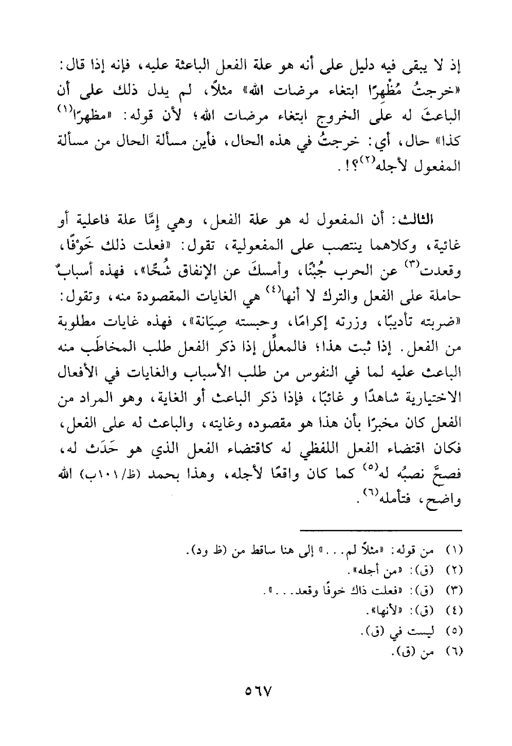 وتقول ضربته تأديبا وزرته إكراما وحبسته صيانة فهذه غايات مطلوبة من الفعل إذا ثبت هذا فالمعلل إذ ذكر الفعل طلب المخاطب منه الباعث عليه لما في النفوس من طلب الأسباب والغايات في الأفعال الإختيارية شاهدا أو غائبا فإذا ذكر الباعث أو الغاية وهو المراد من الفعل كان مخبرا بأن هذا هو مقصوده وغايته والباعث له على الفعل فكان اقتضاء الفعل اللفظي كاقتضاء الفعل الذي هو حدث له فصح نصبه له كما كان واقعا لأجله وهذا بحمد الله واضح فتامل @