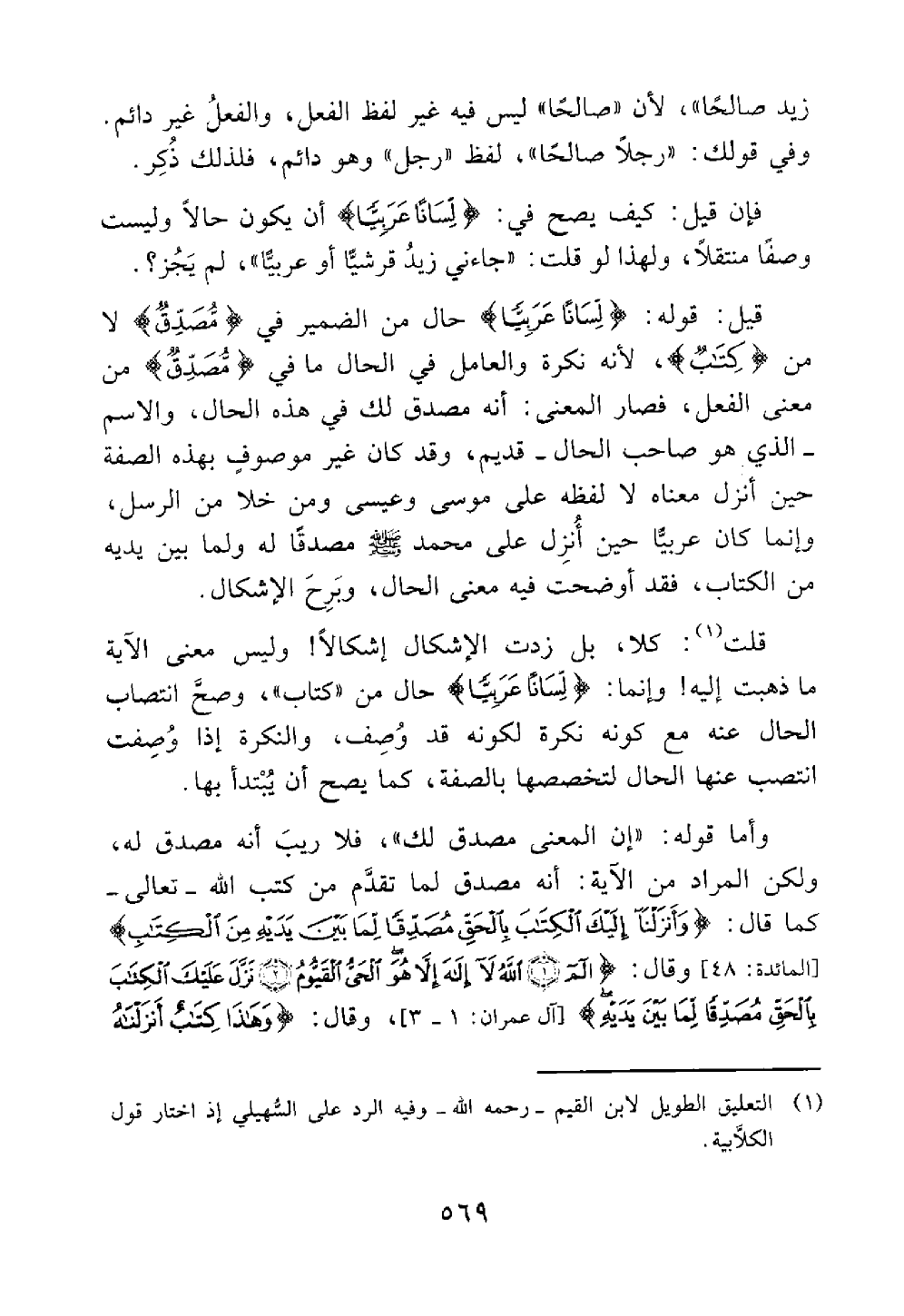 قلت كلا بل زدت الإشكال إشكالا وليس معنى الآية ما ذهبت إليه وإنما لسانا عربيا حال من كتاب وصح انتصاب الحال عنه مع كونه نكرة لكونه قد وصف والنكرة إذا وصفت انتصب عنها الحال لتخصصها بالصفة كما يصح أن يبتدأ بها
